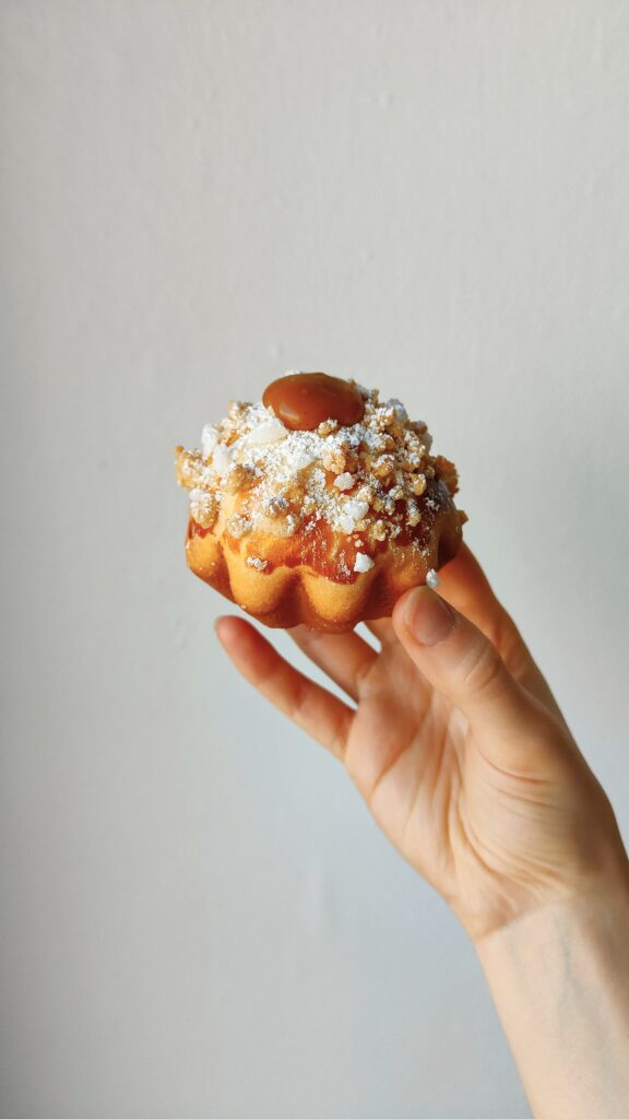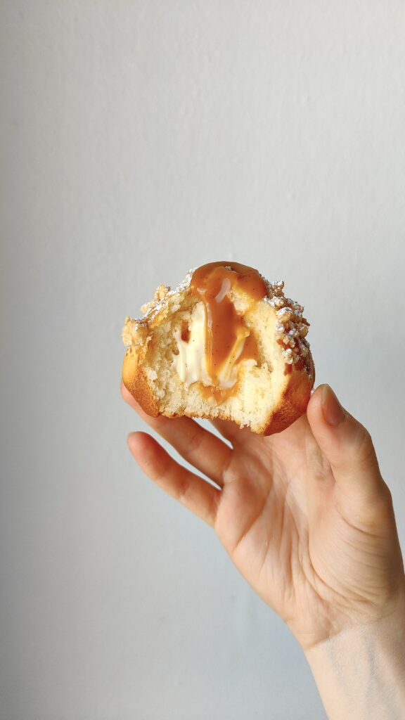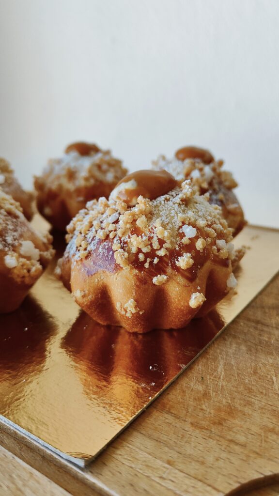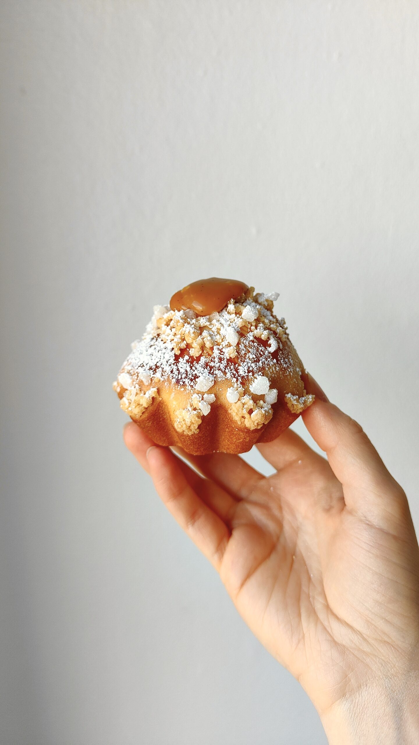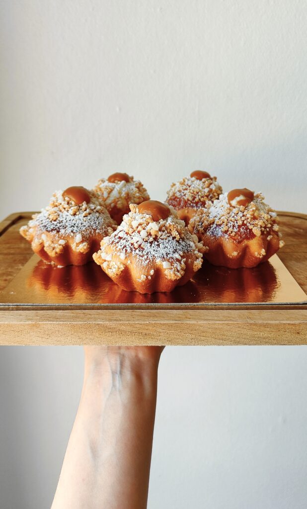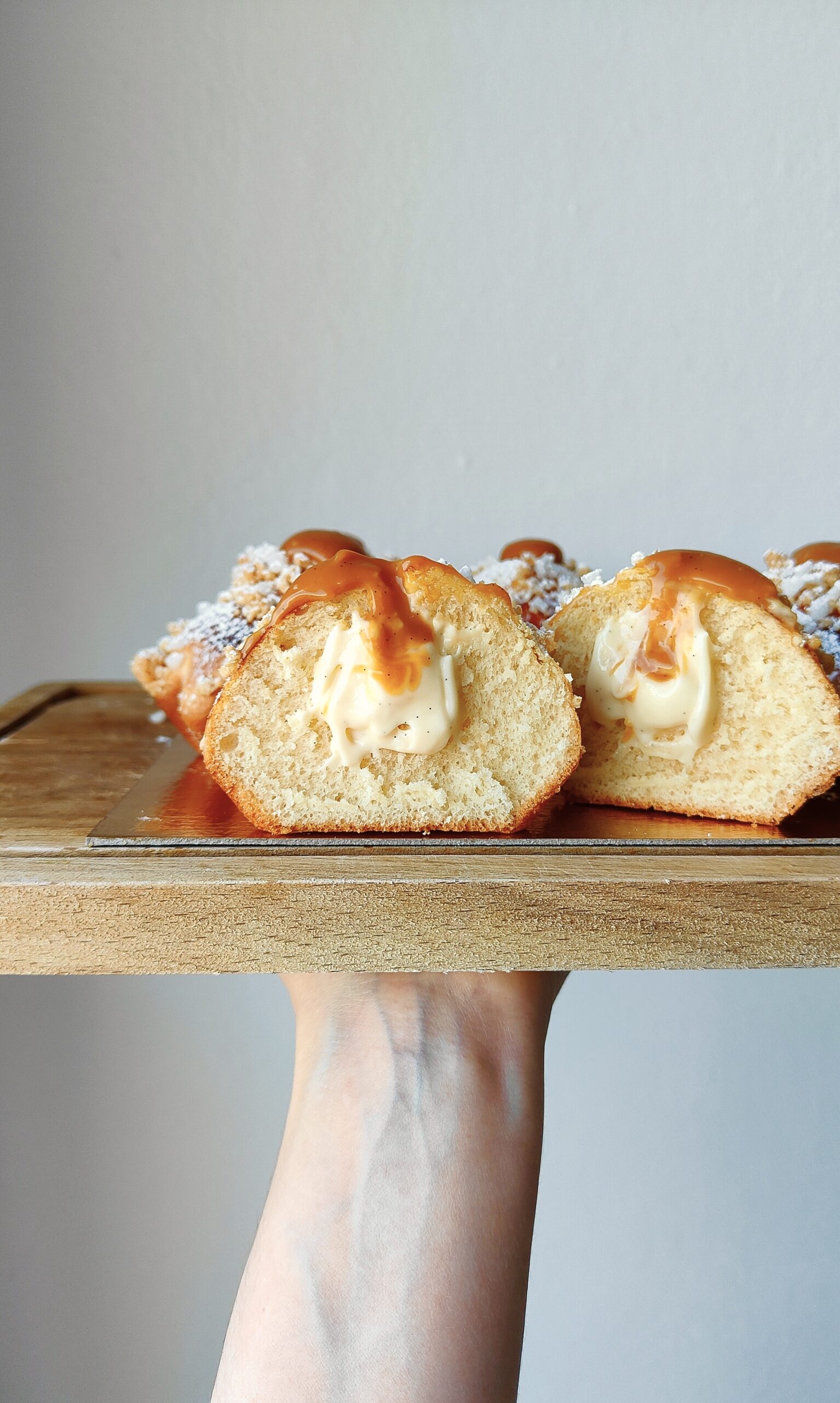 Voici ces petites brioches fourrées toutes moelleuses, inspirées de la recette du chef Yann Couvreur, extraite de son livre "12 Saisons". Elles sont garnies généreusement d'une crème à flan onctueuse, d'un caramel à la vanille, et parsemées d'un streusel ainsi que de sucre en grains pour le côté croquant. Le tout est relevé d'un léger arôme d'eau de fleur d'oranger. De vraies petites douceurs !