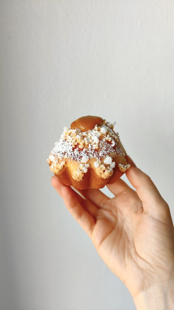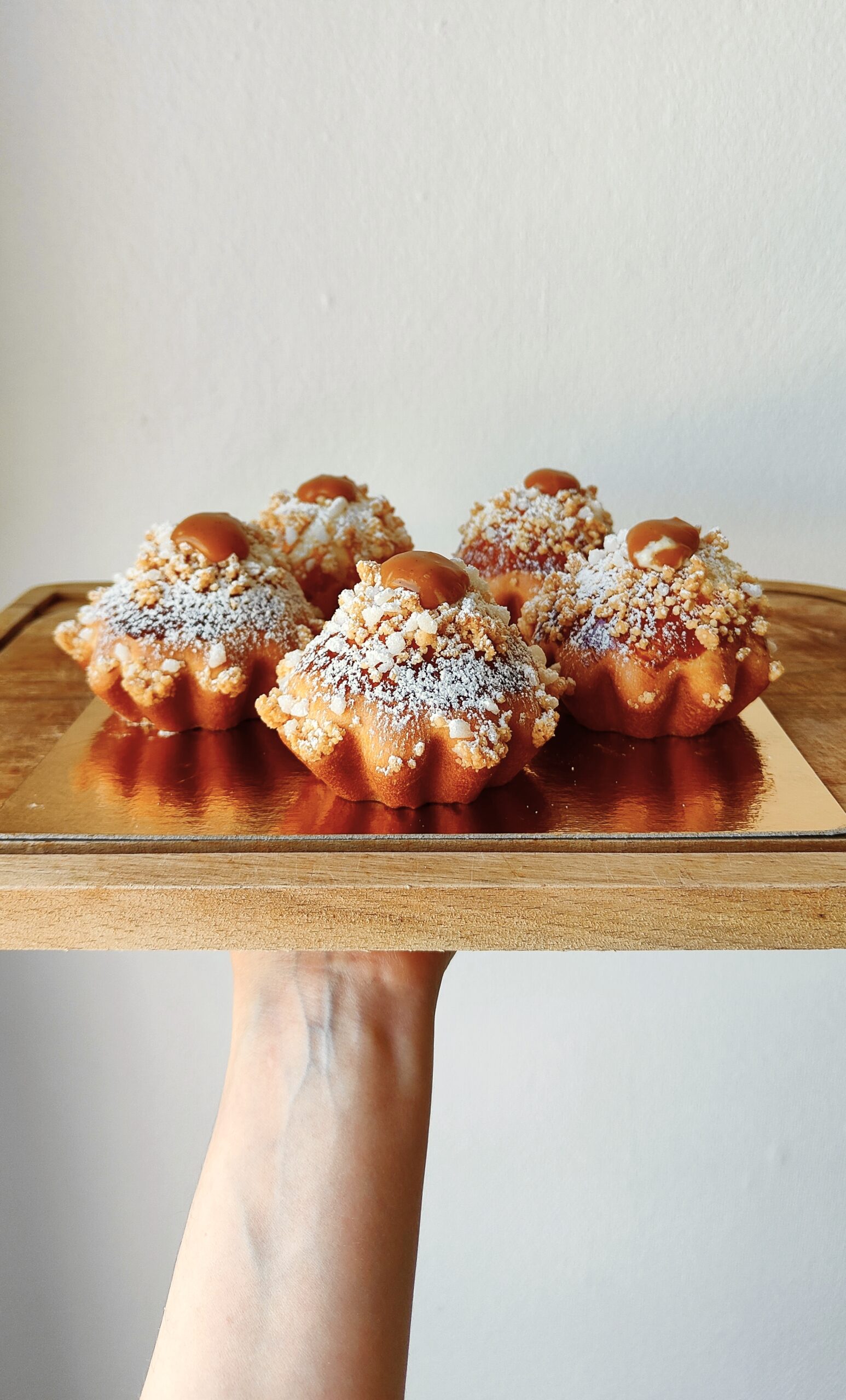 - Saupoudrez-les de sucre glace avec un chinois étamine, puis insérez un peu de caramel-vanille dans chacune de brioches.