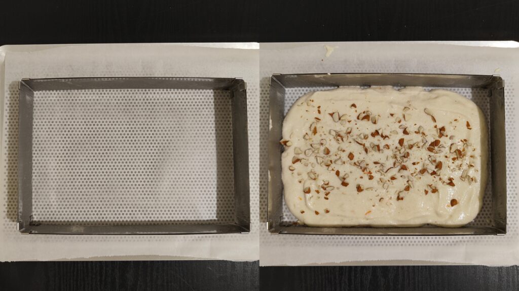 - Placez délicatement la bande de dacquoise par-dessus le crémeux noisette (face amandes hachées collée au crémeux). Appuyez légèrement pour la maintenir en place.
