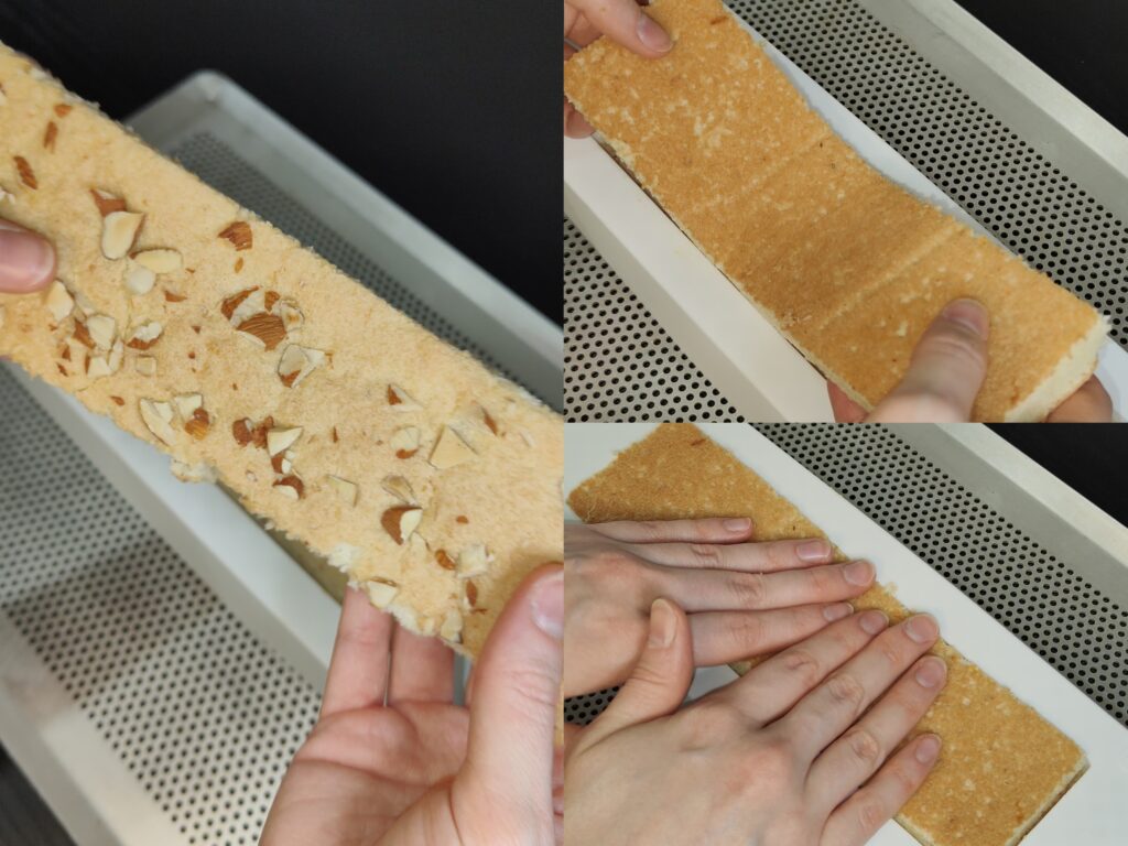 - Placez le streusel amande (croustillant praliné contre la dacquoise) et appuyez légèrement.