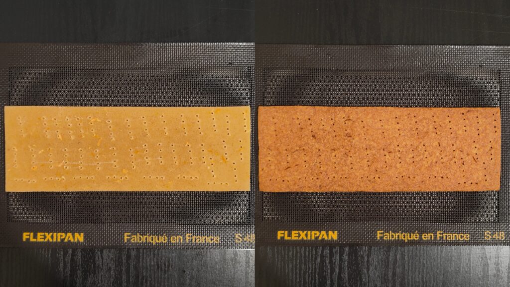 - Enfournez pendant 15-20min (la durée dépend de votre four). La dacquoise est cuite quand elle est légèrement dorée.