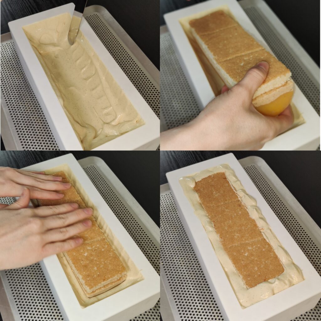 - Appliquez un peu plus de la moitié de la mousse vanille dans le moule à bûche.