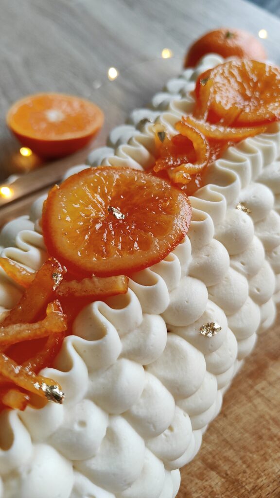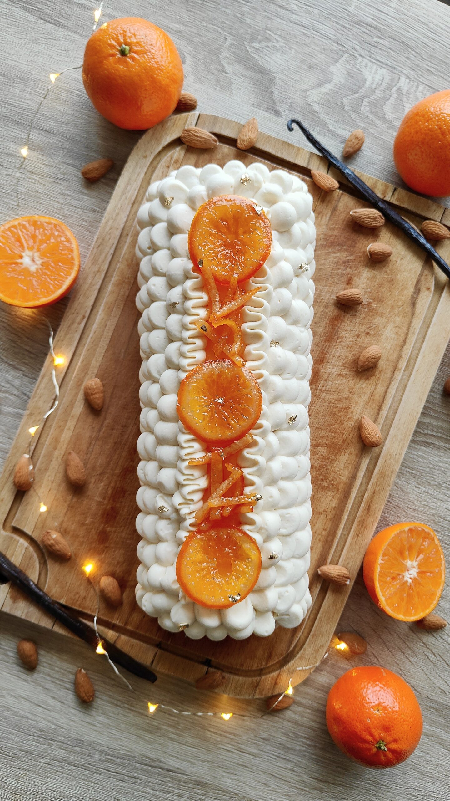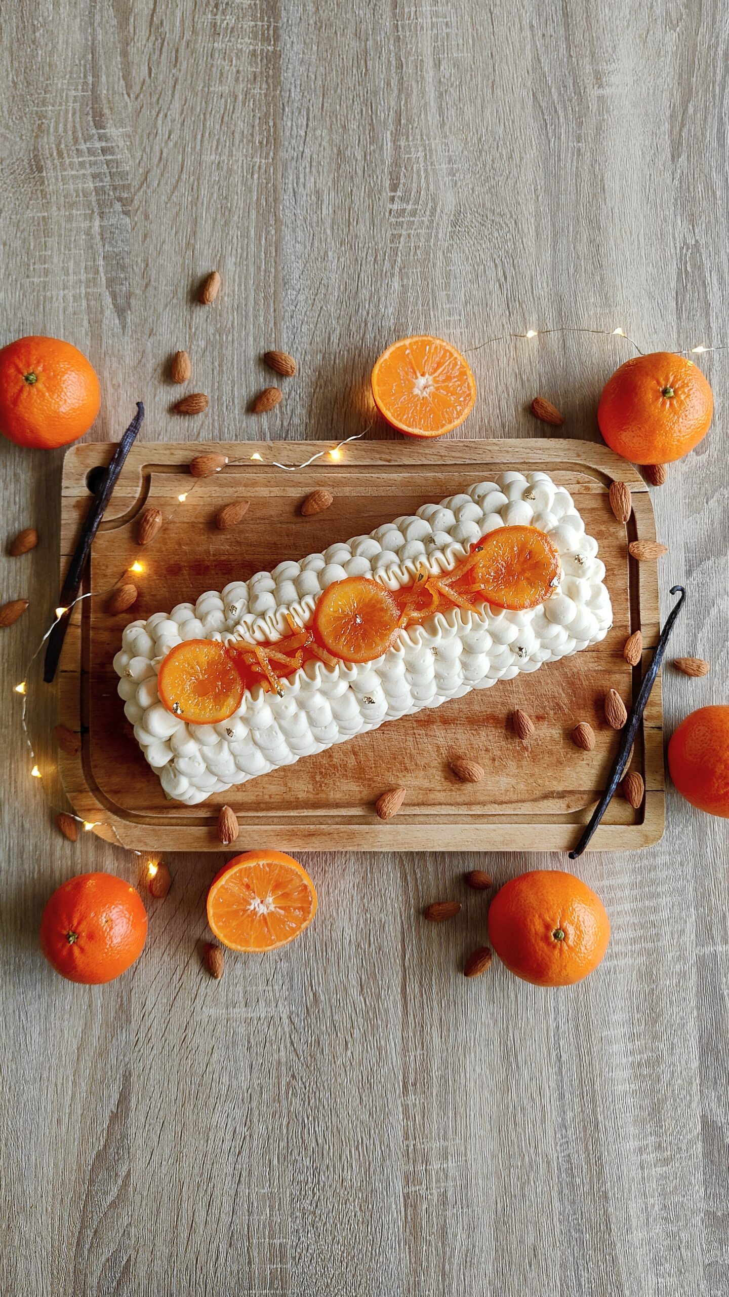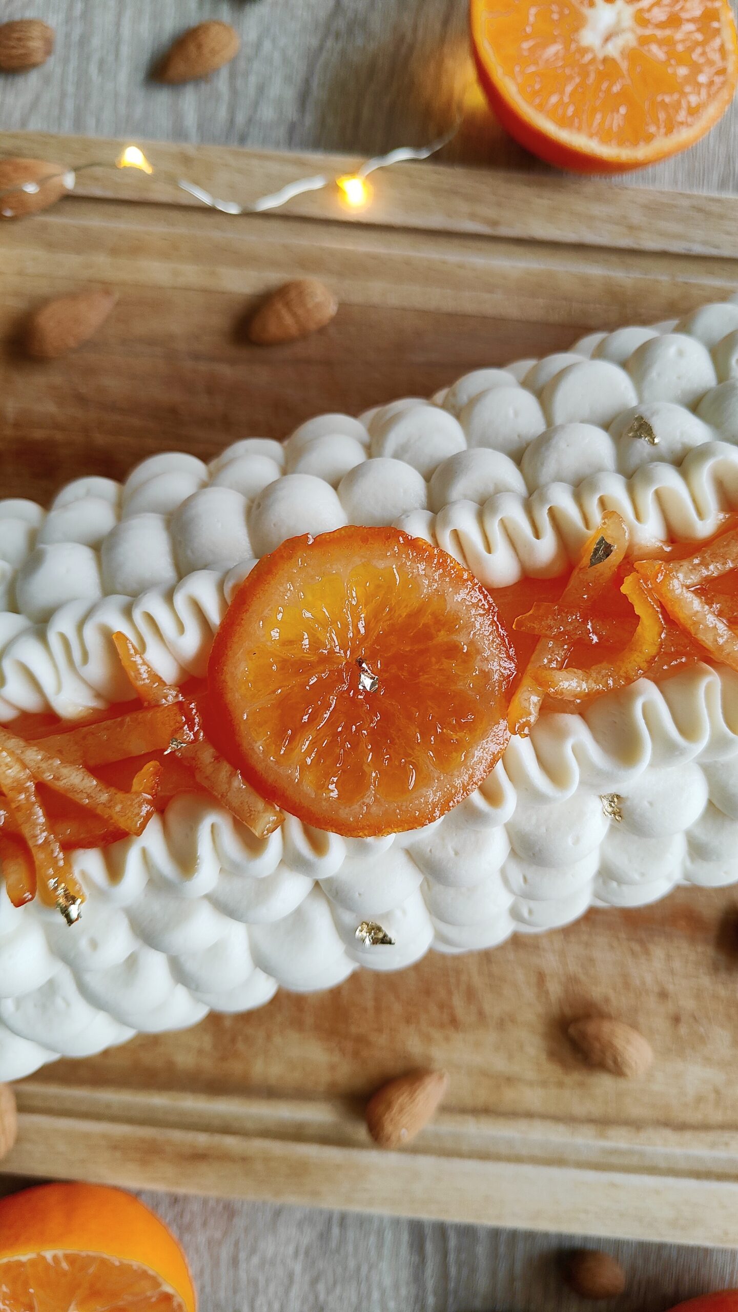 - Laissez la bûche décongelée pendant 8-10h minimum. Appliquez le restant de confit de mandarines au centre et vos morceaux de mandarines confites.