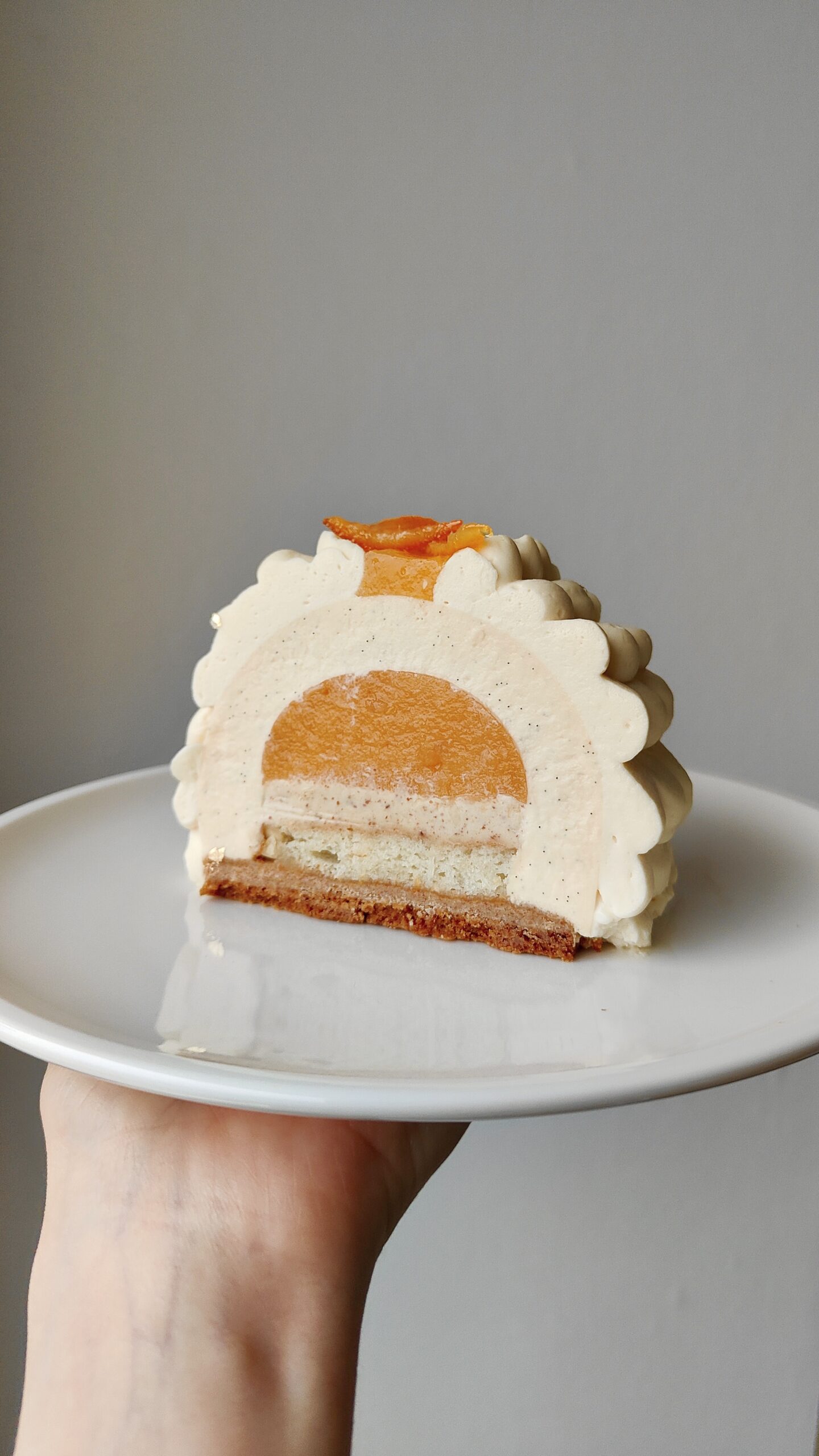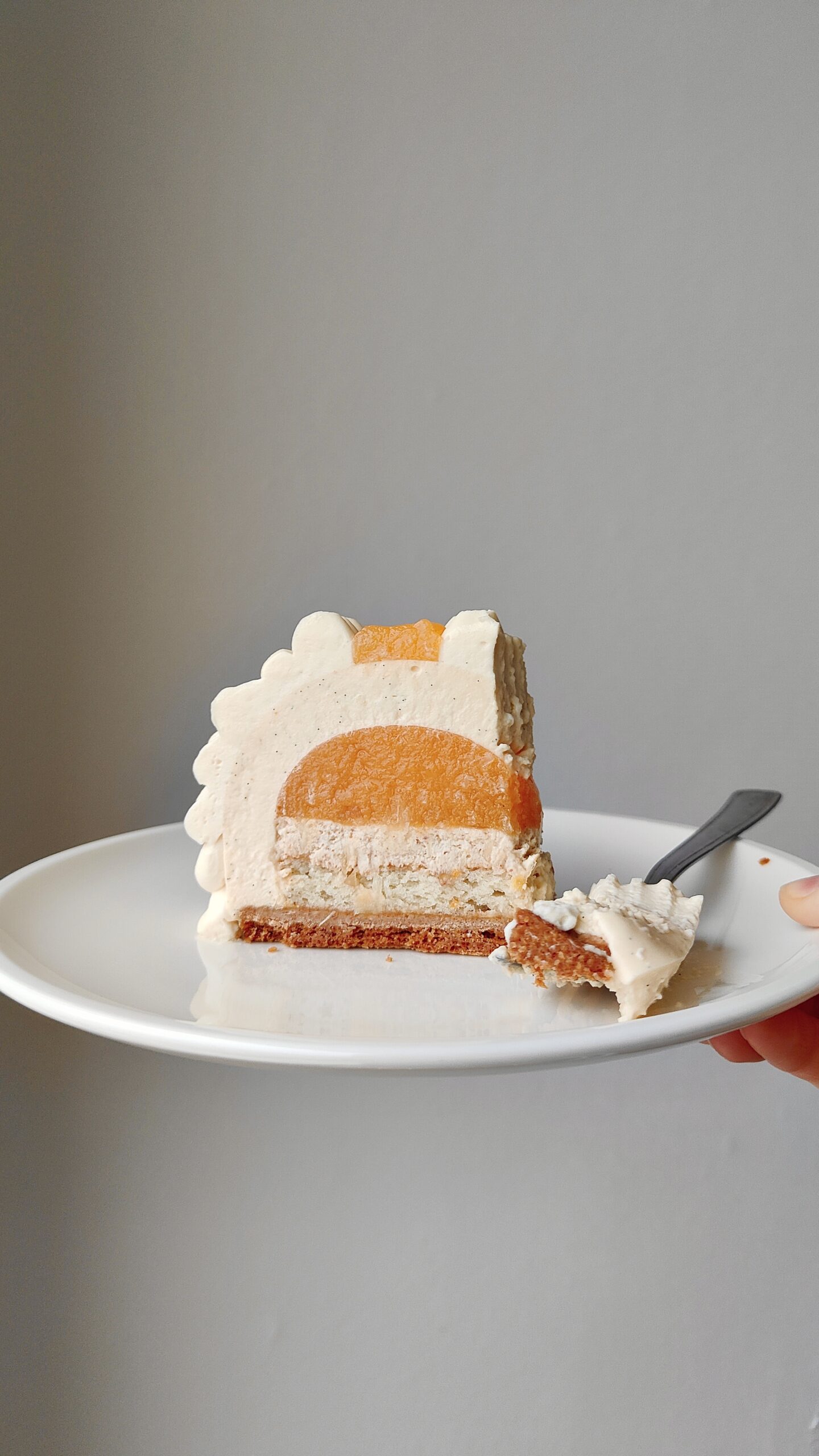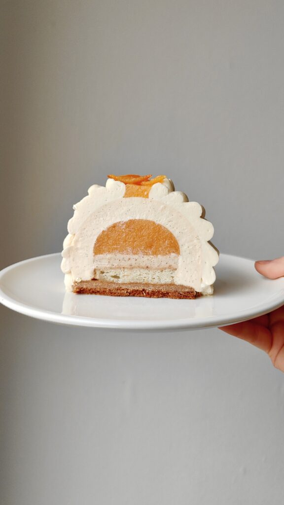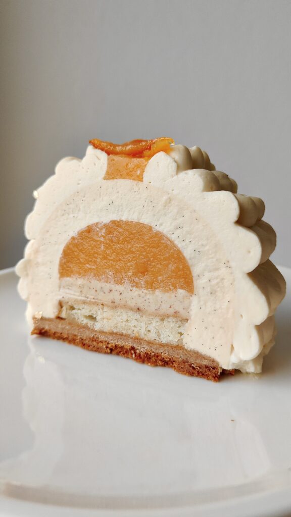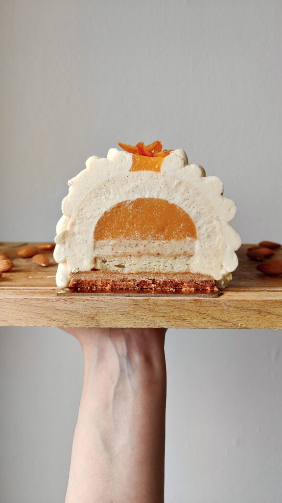 - Détendez également votre crémeux et appliquez-le par-dessus le confit de mandarines (1 cm d'épaisseur). Lissez la surface et placez au congélateur 5min avant de placer la bande de dacquoise.