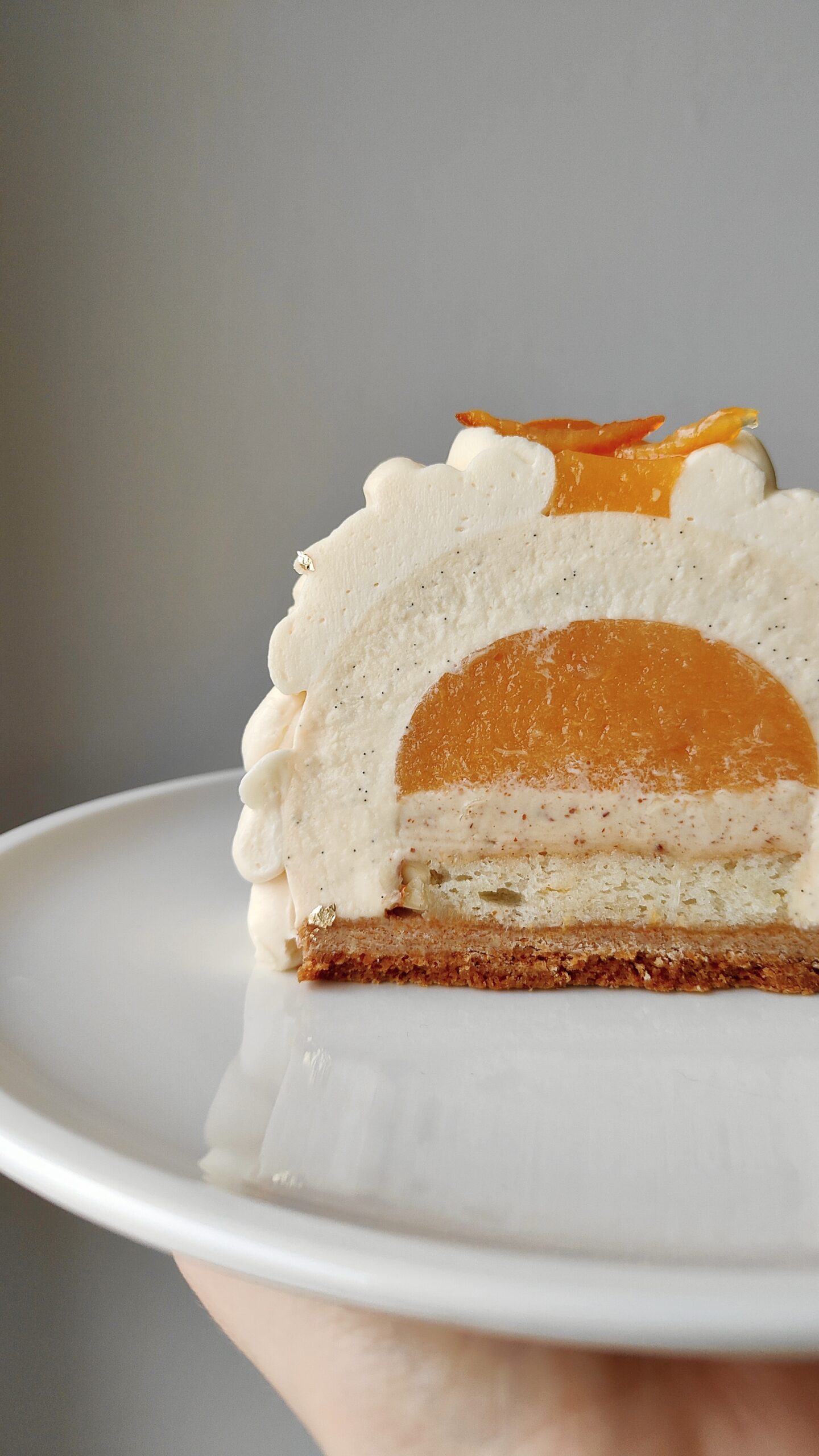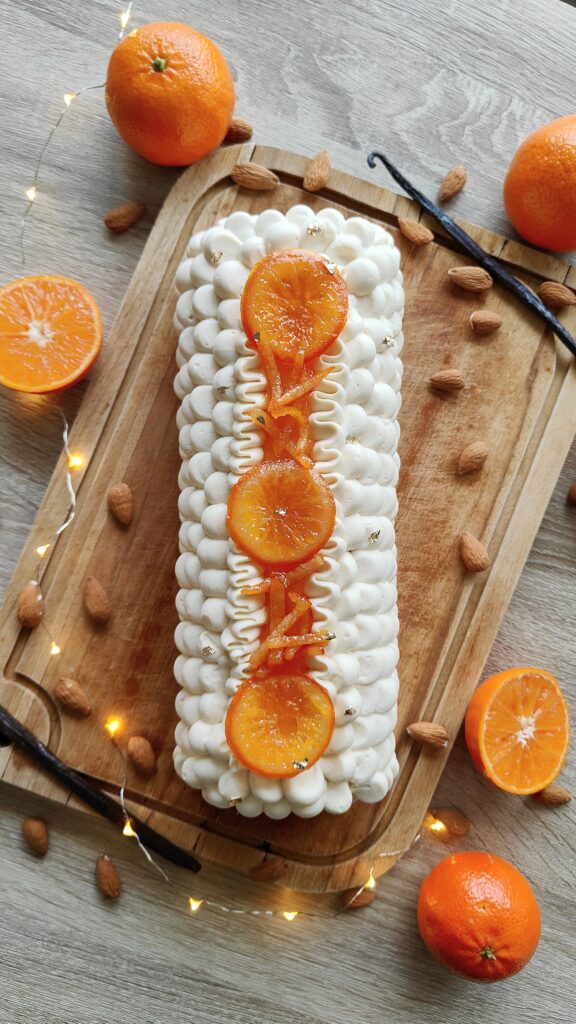Une bûche où acidité, douceur et légèreté s'équilibrent avec subtilité, pour une expérience raffinée, gourmande et harmonieuse.Un confit de mandarines maison fruité et acidulé. Un crémeux praliné amande, une dacquoise amande moelleuse et un streusel amande croquant, enrobés d'une légère mousse bavaroise à la vanille. Et pour finir, une ganache montée au miel de châtaignier, très aérienne, qui apporte une douceur ronde et légèrement boisée, liant l'ensemble de ces saveurs.