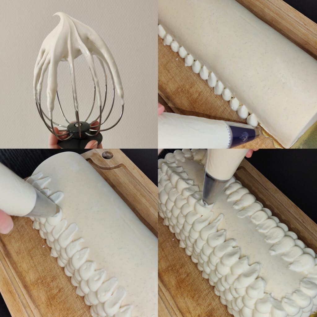 - Pochez des petites boules de ganache montée en commençant par le bas de la bûche et de bas en haut tout autour de la bûche. Laissez un espace vide au sommet de la bûche.