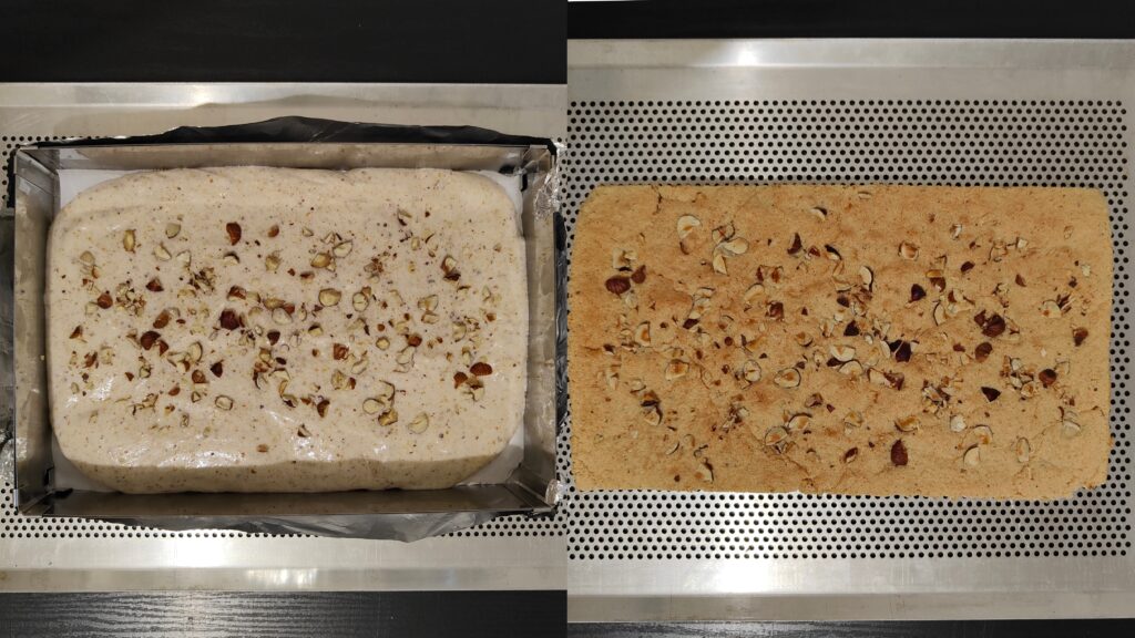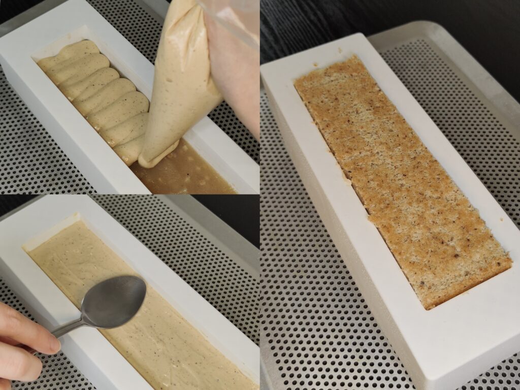 - Placez délicatement la bande de dacquoise noisette par-dessus le crémeux noisette (face noisettes hachées collée au crémeux).