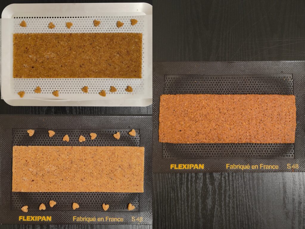 - À l'aide d'une spatule (ou le dos d'une cuillère), appliquez une fine couche de croustillant praliné sur le rectangle de streusel noisette.Réservez jusqu'au montage.