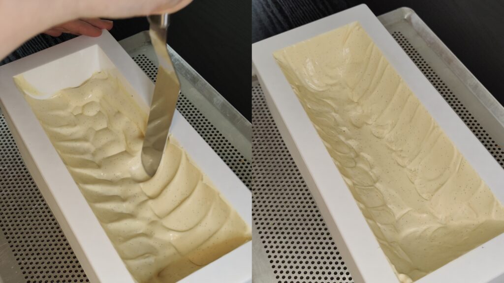 - Avec une spatule ou une grande cuillère, remontez la mousse le long du moule, de sorte à faire disparaître les bords du moule.