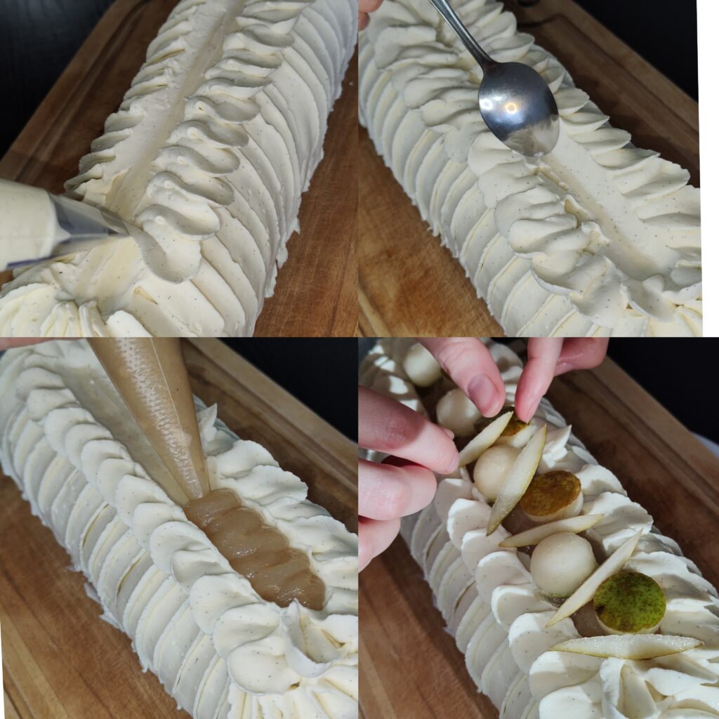 - Pochez des bandes de ganache montée de bas en haut tout autour de la bûche, en veillant à ce qu'elles se chevauchent légèrement. Retirez l'excedent de ganache au sommet de la bûche.Au centre, réalisez un autre pochage et retirez à nouveau l'excedent de ganache à l'aide d'une cuillère à café pour y accueillir le restant de confit de poires.