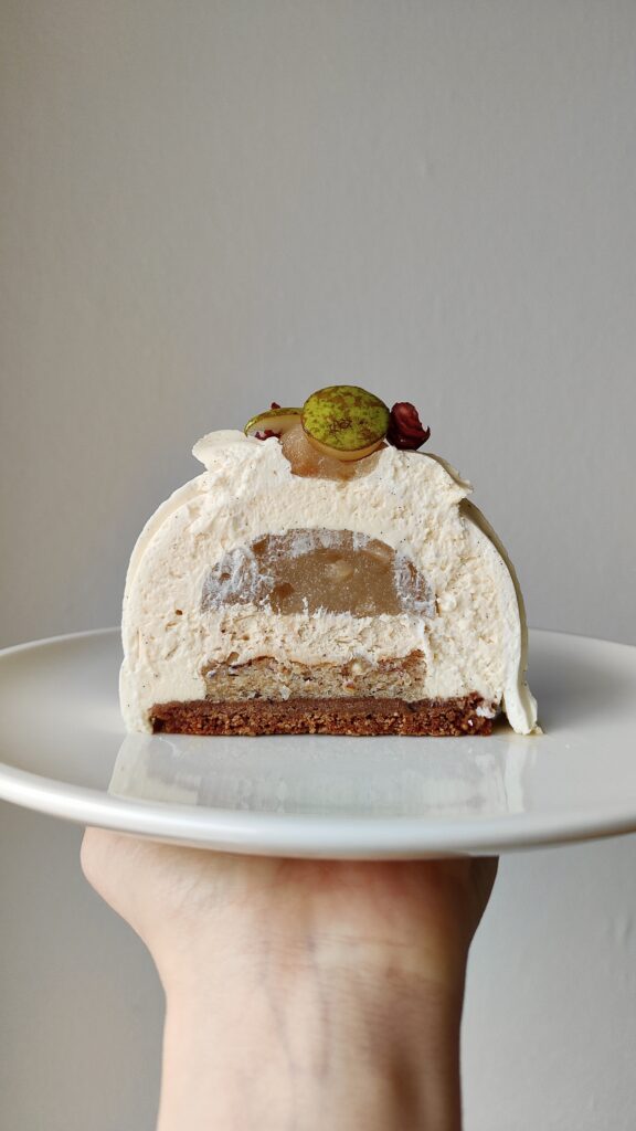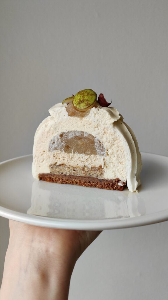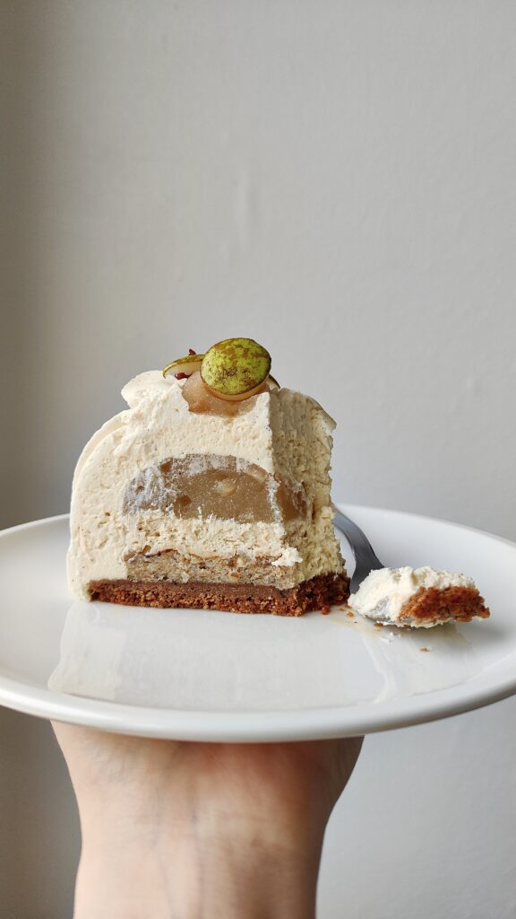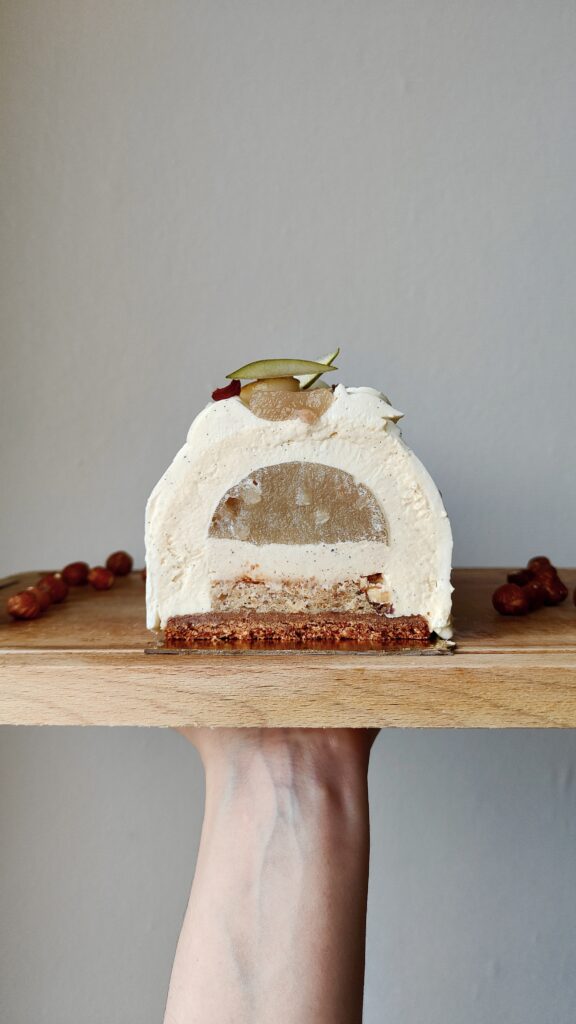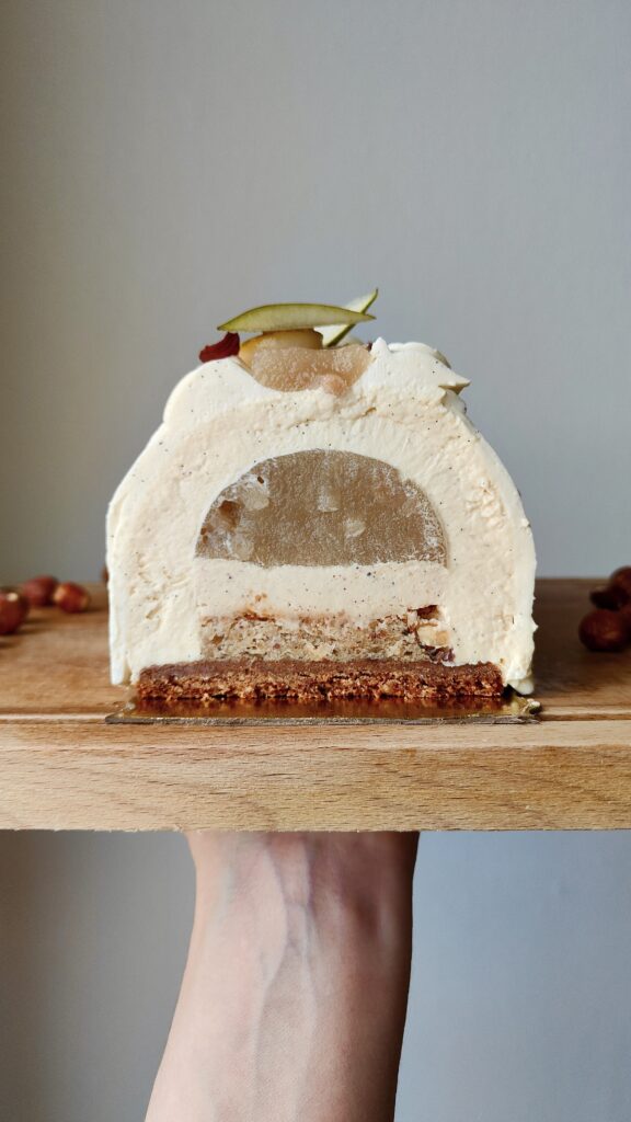 - Détendez également votre crémeux et appliquez-le par-dessus le confit de poires.(1 cm d'épaisseur)Lissez la surface et placez au congélateur 5-10min avant de placer la bande de dacquoise.