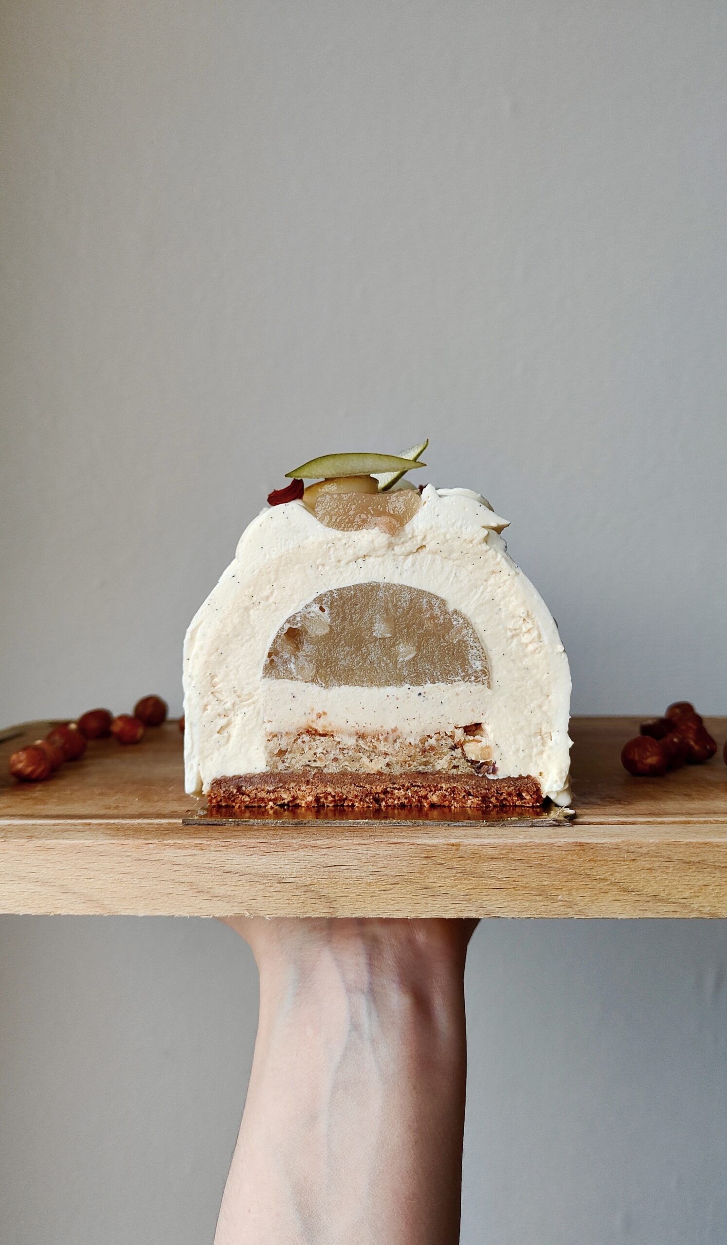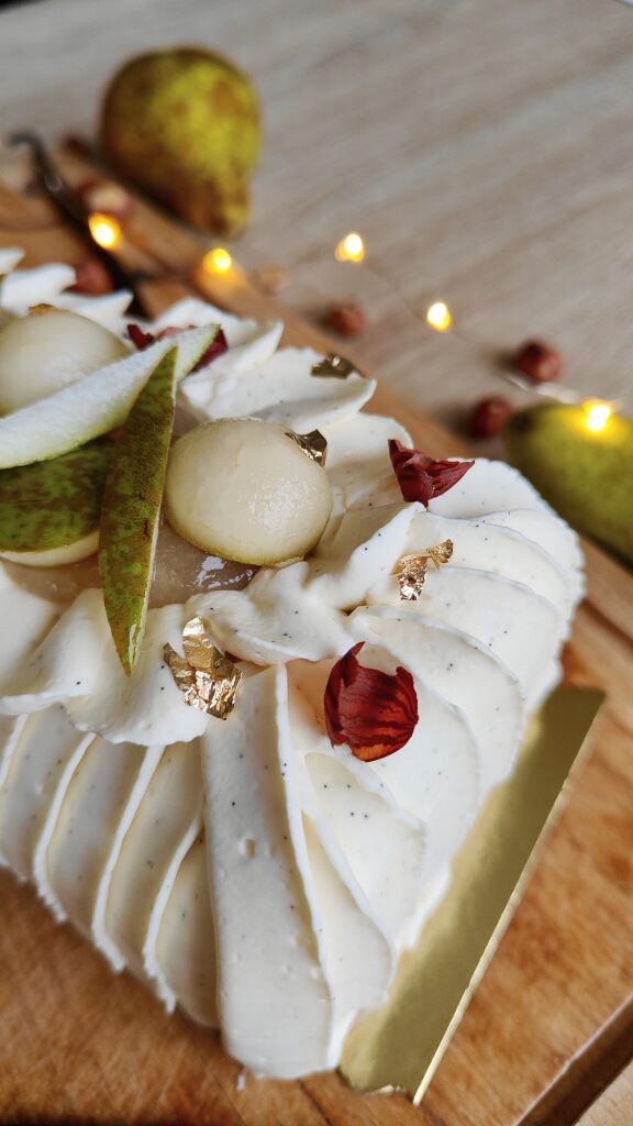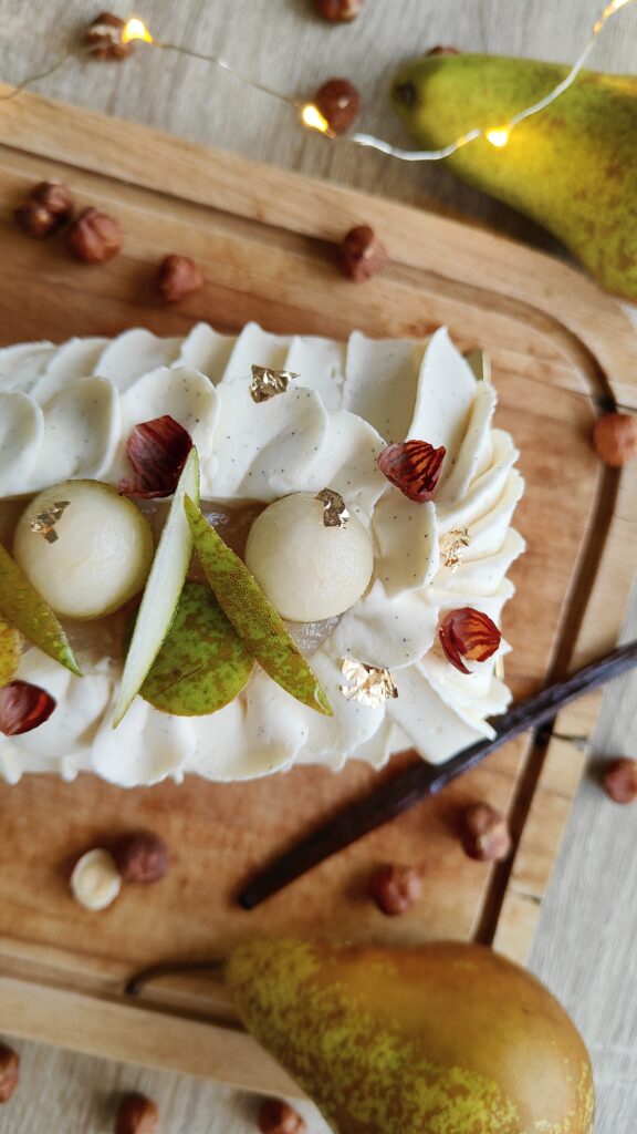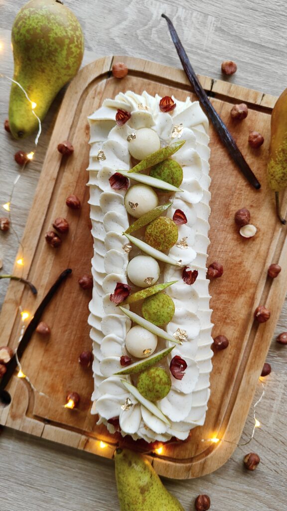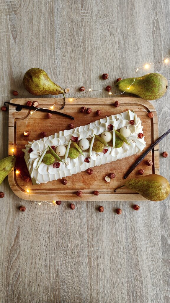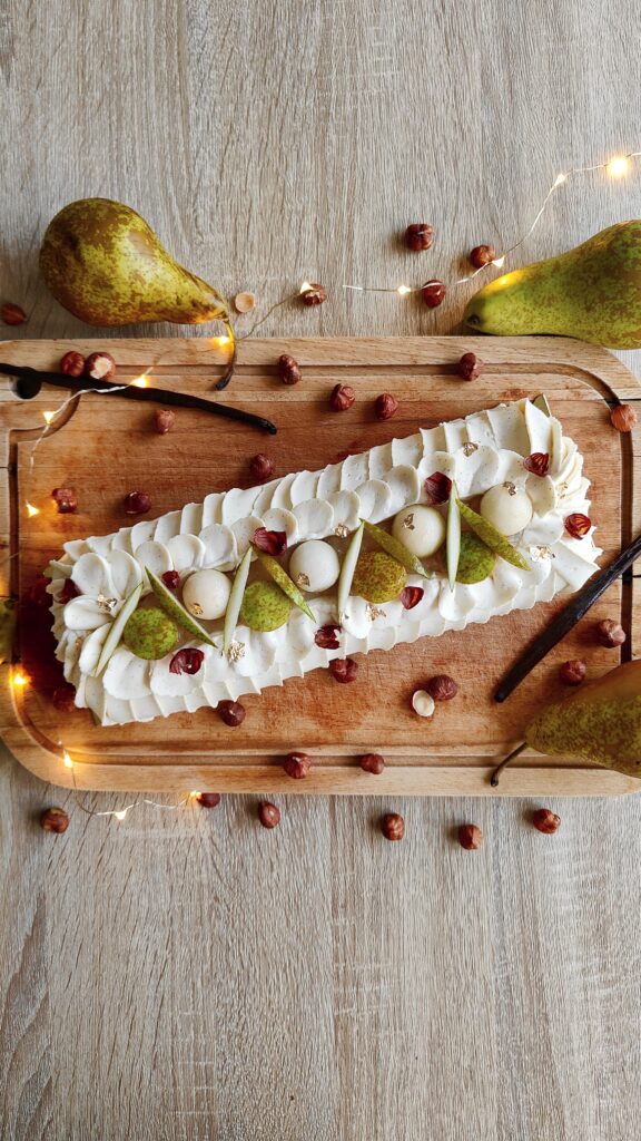 Première bûche de l'année et surtout première bûche tout court pour moi ! Une bûche toute douce avec un insert mêlant confit de poires et crémeux noisette, d'une dacquoise moelleuse, puis d'un streusel croquant et croustillant. Le tout enveloppé d'une mousse vanille légère et recouvert d'une fine couche de ganache montée à la vanille.