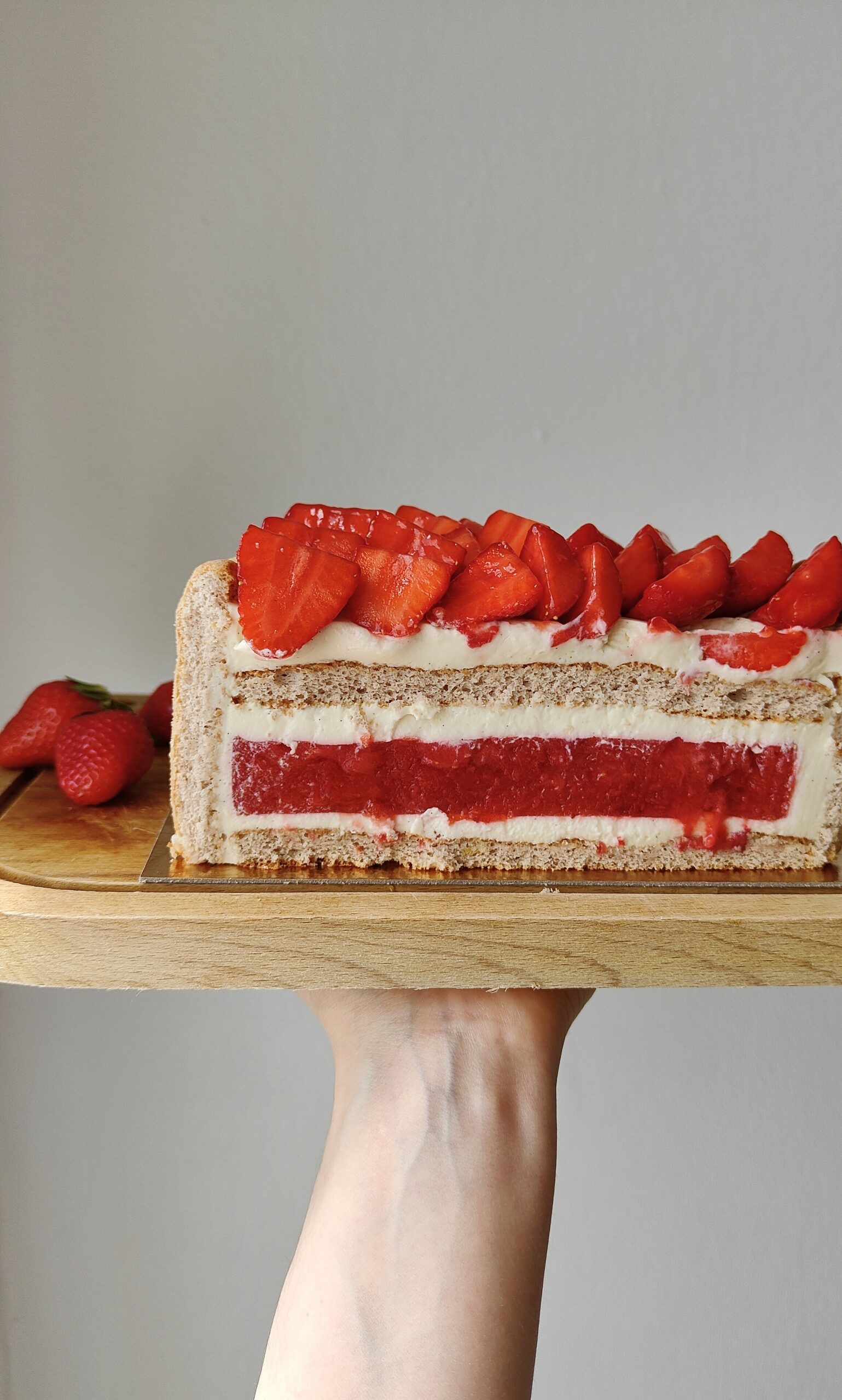 Des biscuits cuillère maison à la poudre de fraises lyophilisées pour le petit goût acidulé, un insert intense à la fraise, une crème bavaroise à la vanille légère et beaucoup de fraises fraîches… Classique, mais qui fait toujours son effet !