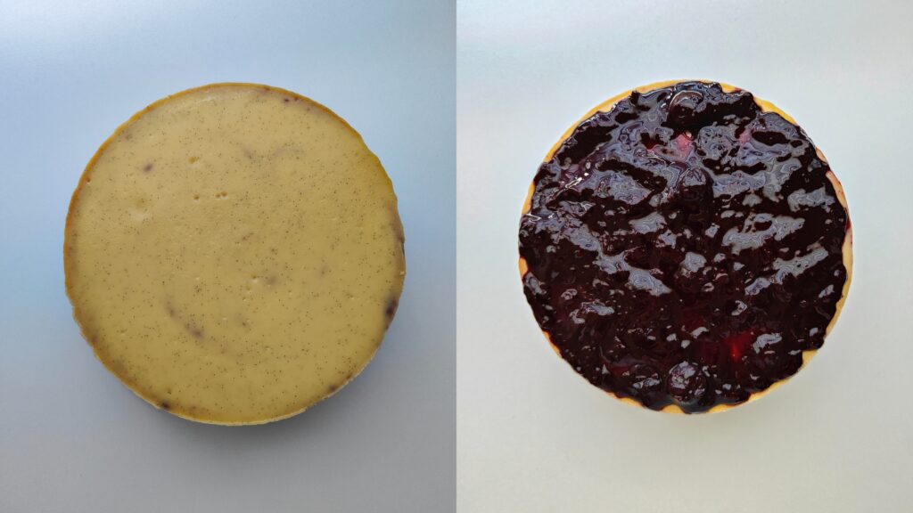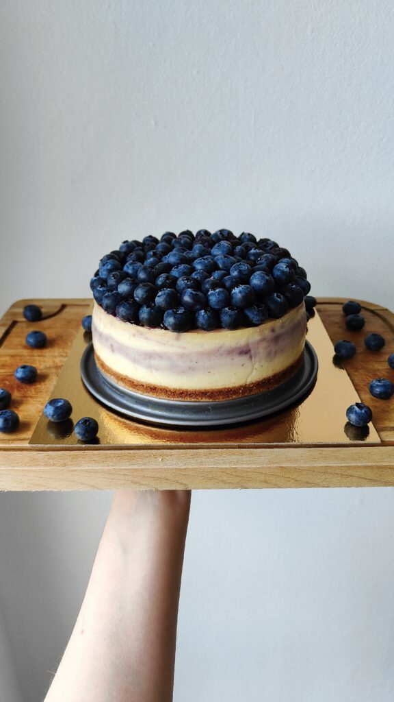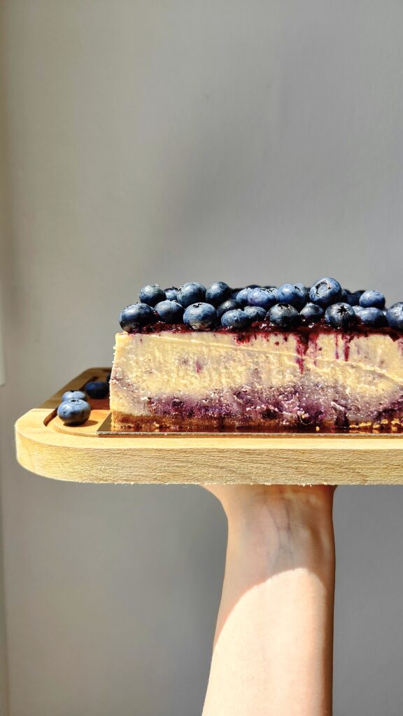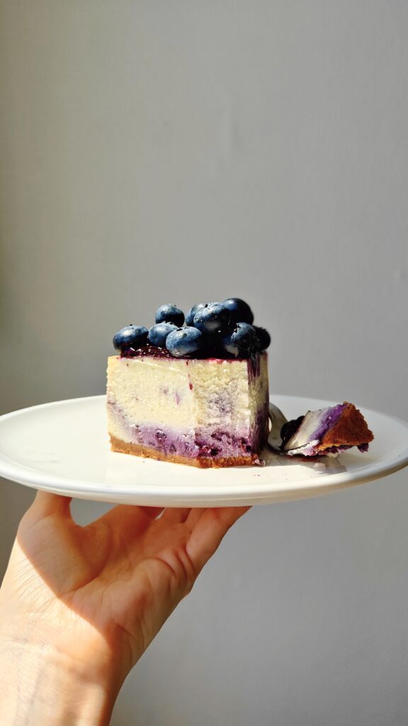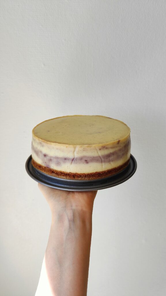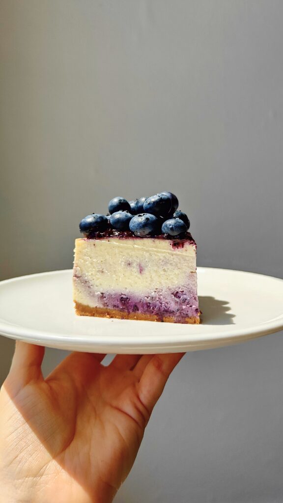 Je décrirais ce cheesecake comme un petit nuage vanillé, doux, ferme et crémeux en bouche. La compotée de myrtilles à la vanille maison, légèrement acidulée, apporte une fraîcheur qui équilibre sa douceur. La base de spéculoos reconstituée, faite maison, s'accorde parfaitement avec l'ensemble pour créer un équilibre de saveurs et de textures vraiment agréable.
