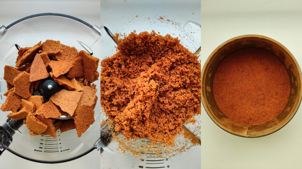 - Vous pouvez passer cette étape en prenant environ 280g de biscuits spéculoos du commerce. La quantité de beurre fondu reste la même.