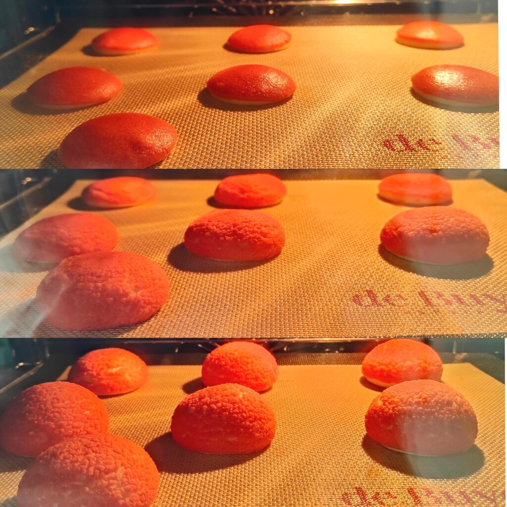 - Enfournez vos choux pendant 35min (la durée dépend de votre four, personnellement je fais entre 33 et 35min pour cette taille de choux). N'OUVREZ PAS LA PORTE DU FOUR pendant la cuisson. Si vous ouvrez, la vapeur s'échappera et vos choux ne gonfleront pas.(Les photos montrent les 10 premières minutes de cuisson des choux)