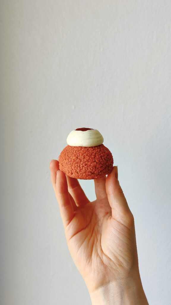 Des petits choux recouverts d'un craquelin tout rose, garnis d'une belle crème diplomate intense en framboises, d'une légère ganache montée à la vanille et d'un petit confit de framboises acidulées !