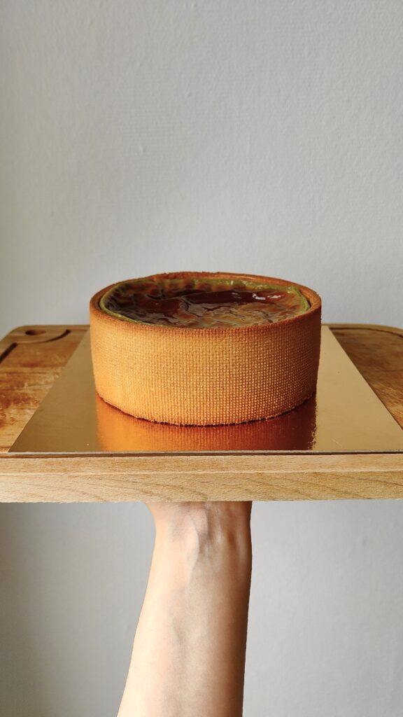 • Versez le tout dans un moule en silicone ou un cercle inférieur à celui du flan à hauteur de 0,8cm à 1cm (0,5cm pour un cercle de 16 x 4,5cm) à peu près.