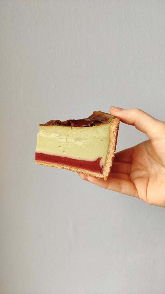 • Versez votre appareil à flan au matcha par-dessus (jusqu'à 1 cm de la hauteur de la pâte) et lissez la surface à l'aide d'une maryse ou d'une cuillère trempée dans de l'eau chaude.