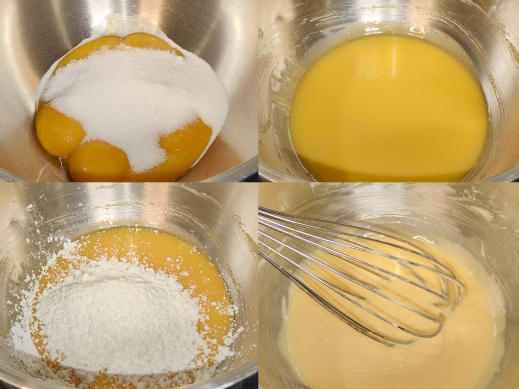 - Dans un cul-de-poule, blanchissez les jaunes d'œufs et le sucre avec un fouet. Ajoutez la fécule de maïs en continuant de fouetter.