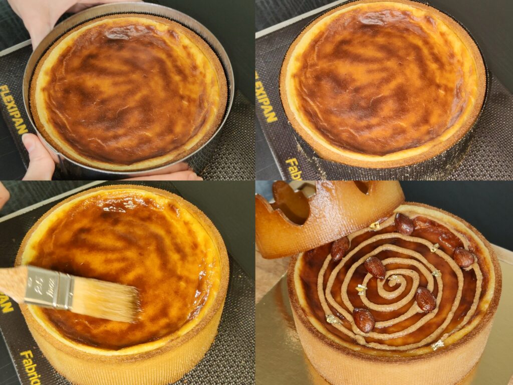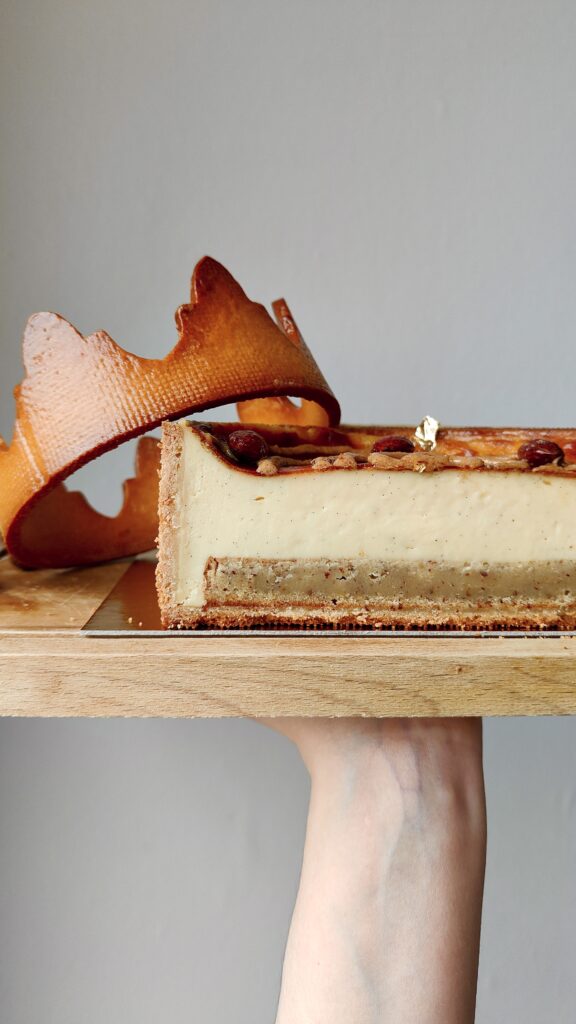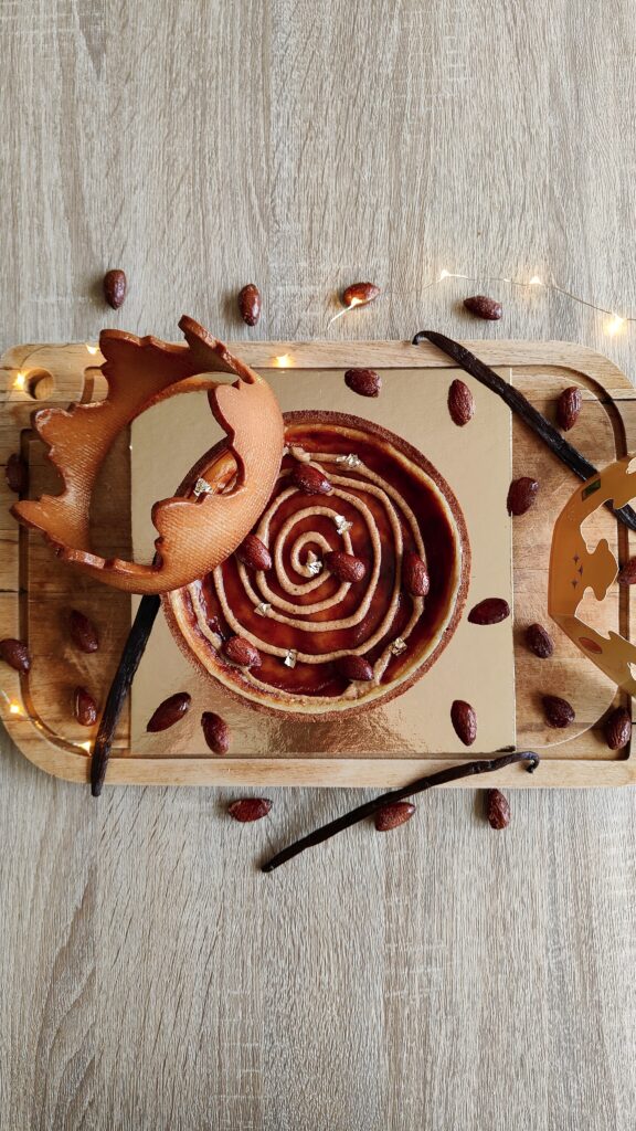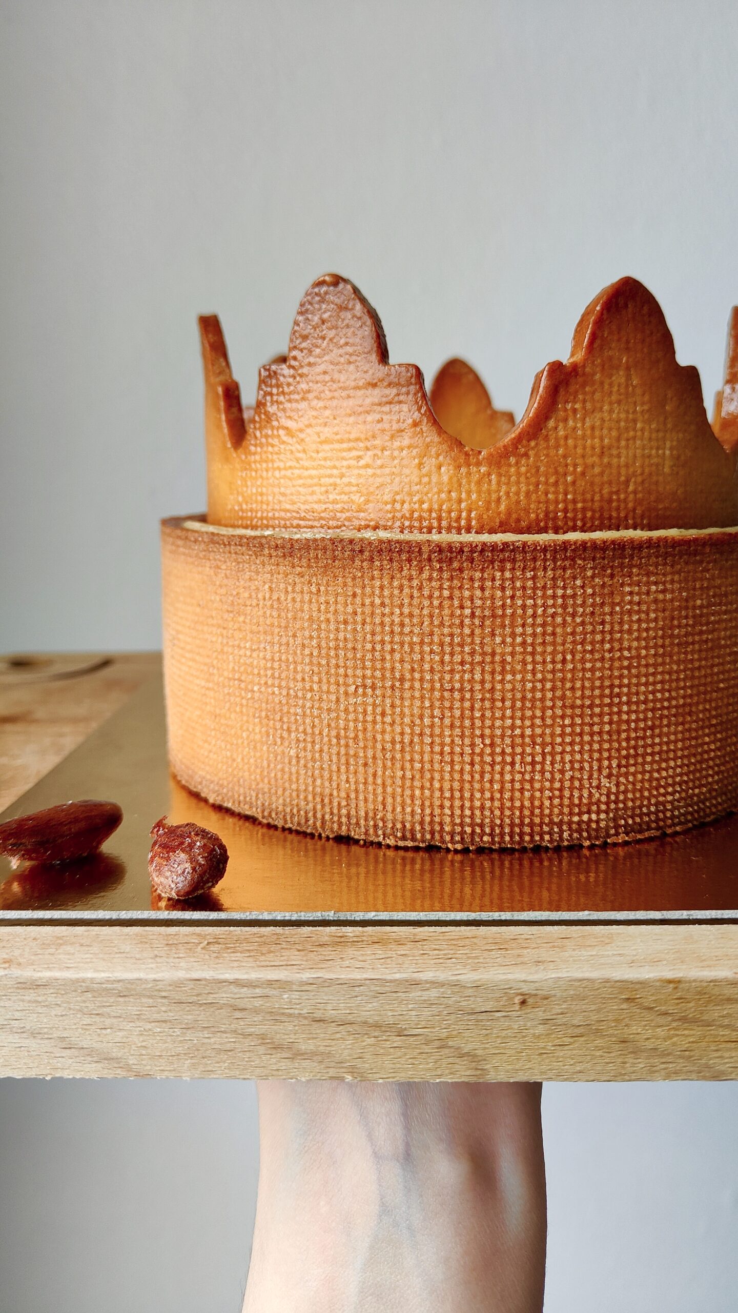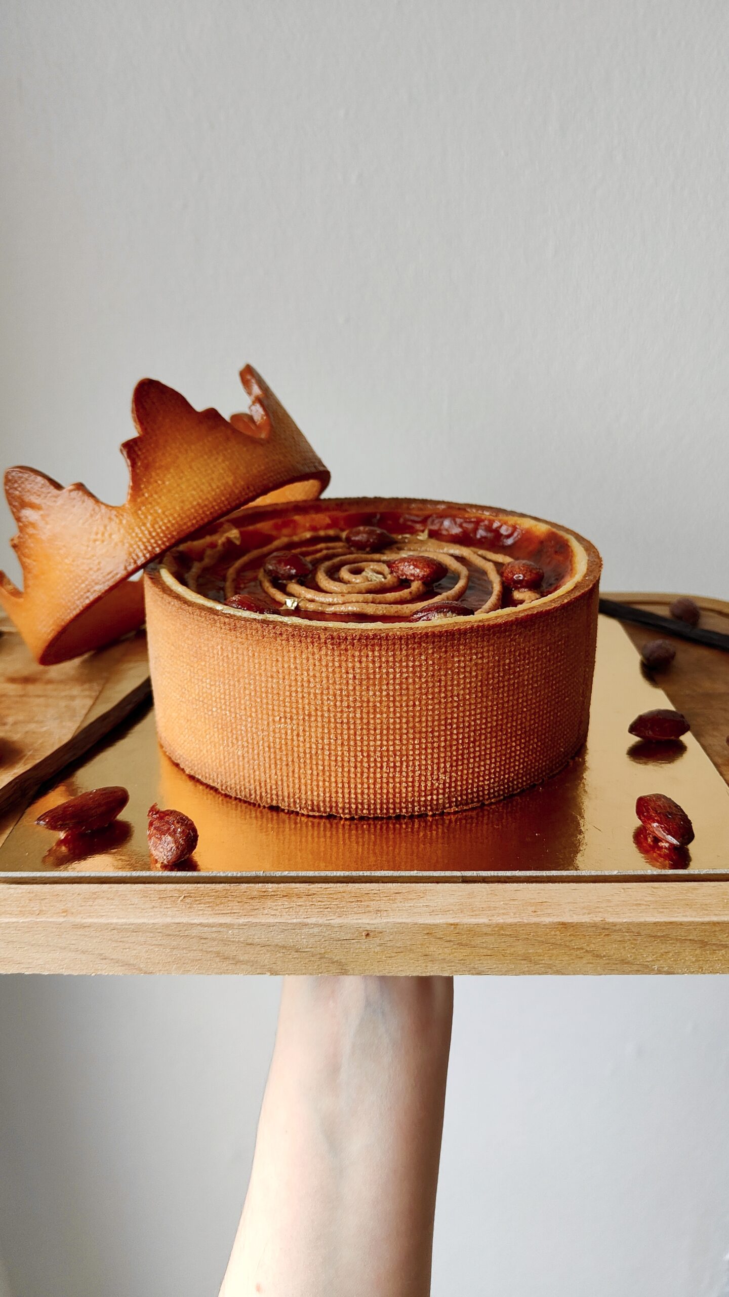 - Vous pouvez appliquer du nappage neutre sur votre flan refroidi pour apporter de la brillance. Ici j'avais un restant de praliné amande et j'ai ajouté quelques amandes caramélisées pour la décoration.Pour la couronne en pâte sucrée : je vous laisse avec ce magnifique tuto d'un de mes comptes préférés sur instagram : @algona78. Je l'ai réalisé avec les restes de pâte sucrée vergeoise, une couronne de 5,5cm de haut que j'ai détouré à l'aide d'un cutter de précision et un cercle de 14cm de diamètre (la couronne faisait 44cm, soit pile la circonférence du cercle). J'ai juste effectué deux cuissons : une première de 20min à 160°C et la deuxième pour la dorure (jaune d'oeuf + 5g de crème liquide entière 30%) pendant 6min.