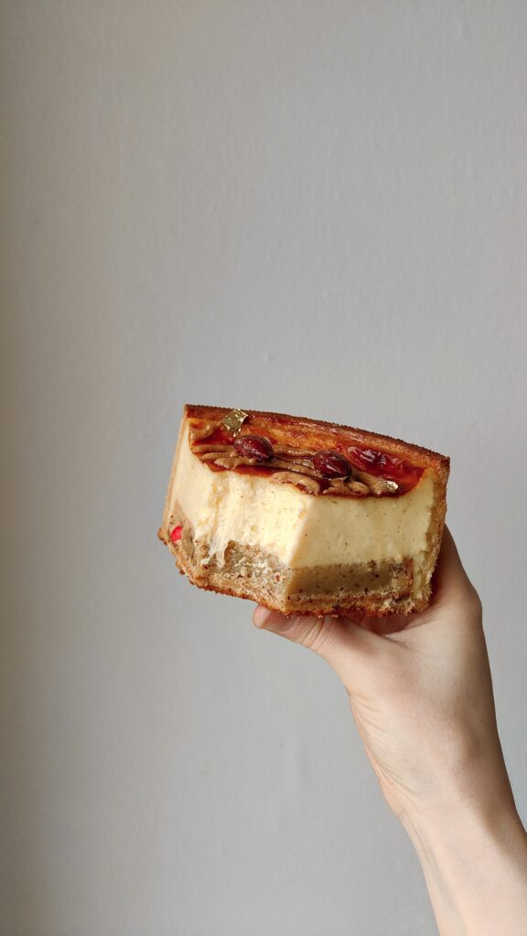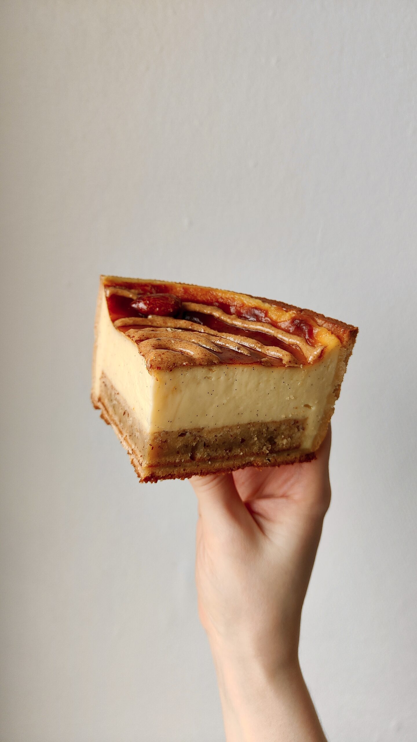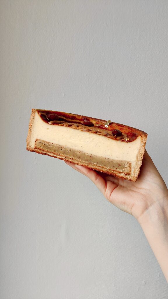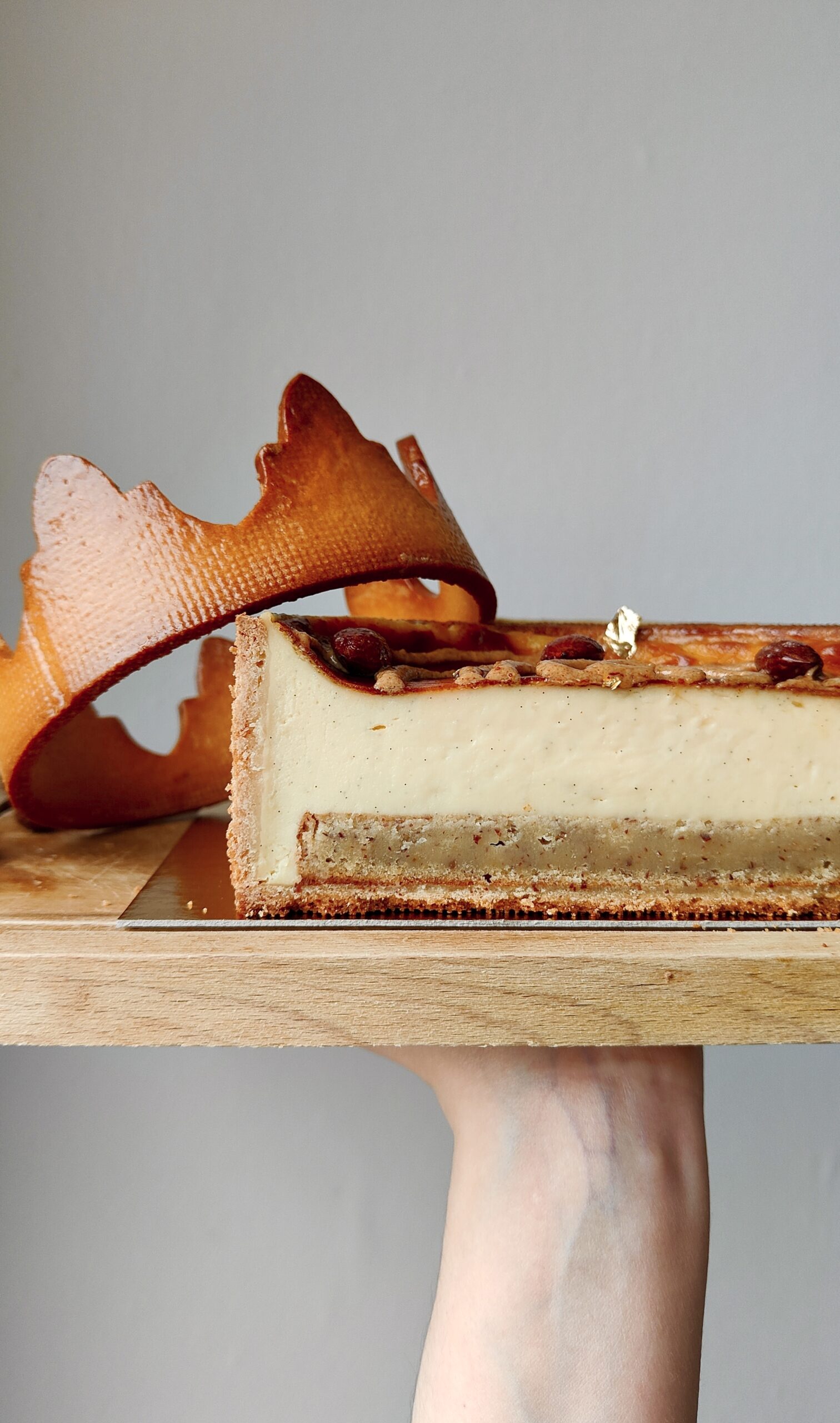 Un flan pâtissier crémeux avec une pâte sucrée vergeoise bien dorée et un insert à la frangipane à la poudre d'amandes complète. Un flan riche et gourmand, inspiré du flan du chef Quinonéro, de la boutique Nèulo.