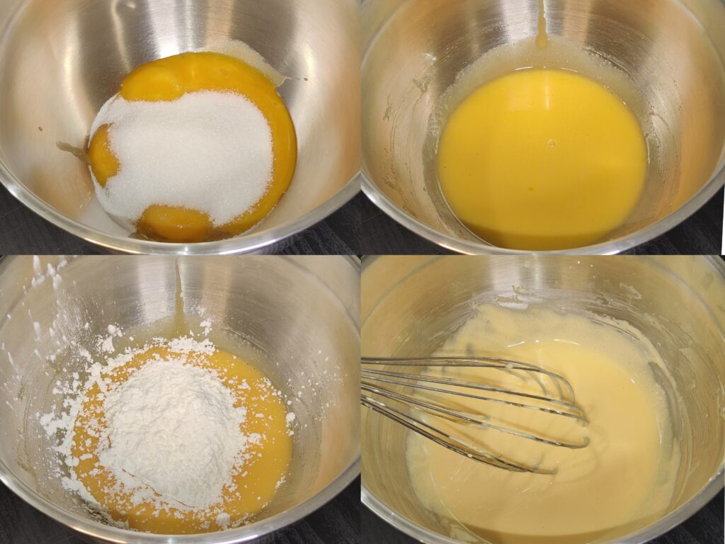 - Dans un cul-de-poule, blanchissez les jaunes d'œufs et le sucre avec un fouet. Ajoutez la fécule de maïs en continuant de fouetter.