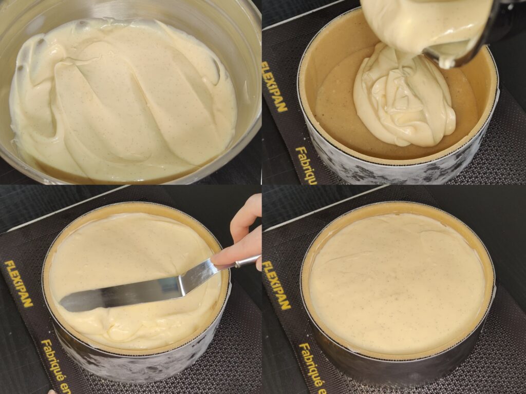 - Versez votre appareil à flan vanille dans le fond de pâte congelé en laissant une marge de 1cm entre le niveau de l'appareil et le haut de la pâte.