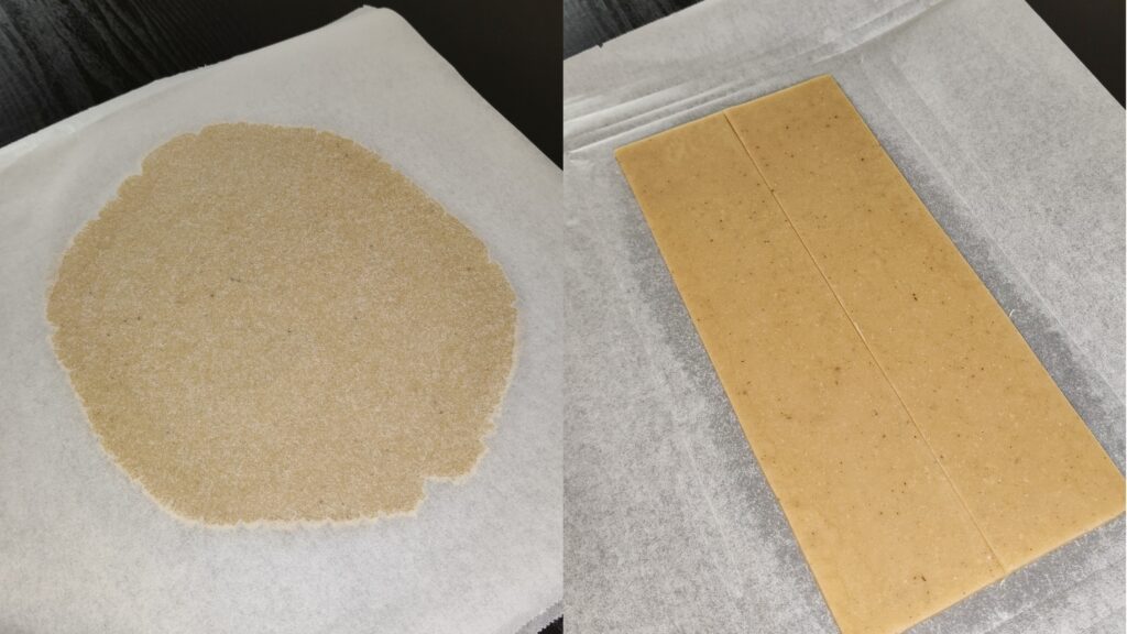 - Le lendemain, abaissez votre pâte à 4mm d'épaisseur entre deux feuilles de papier sulfurisé ou des feuilles de papier guitare.