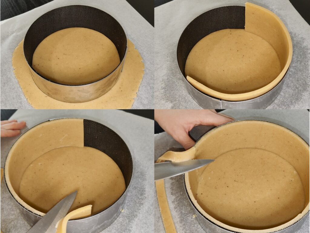 - Placez à l'intérieur le disque de pâte, puis les deux bandes de pâte en les soudant bien entre elles, et arasez l'excédent de pâte avec un couteau bien aiguisé.