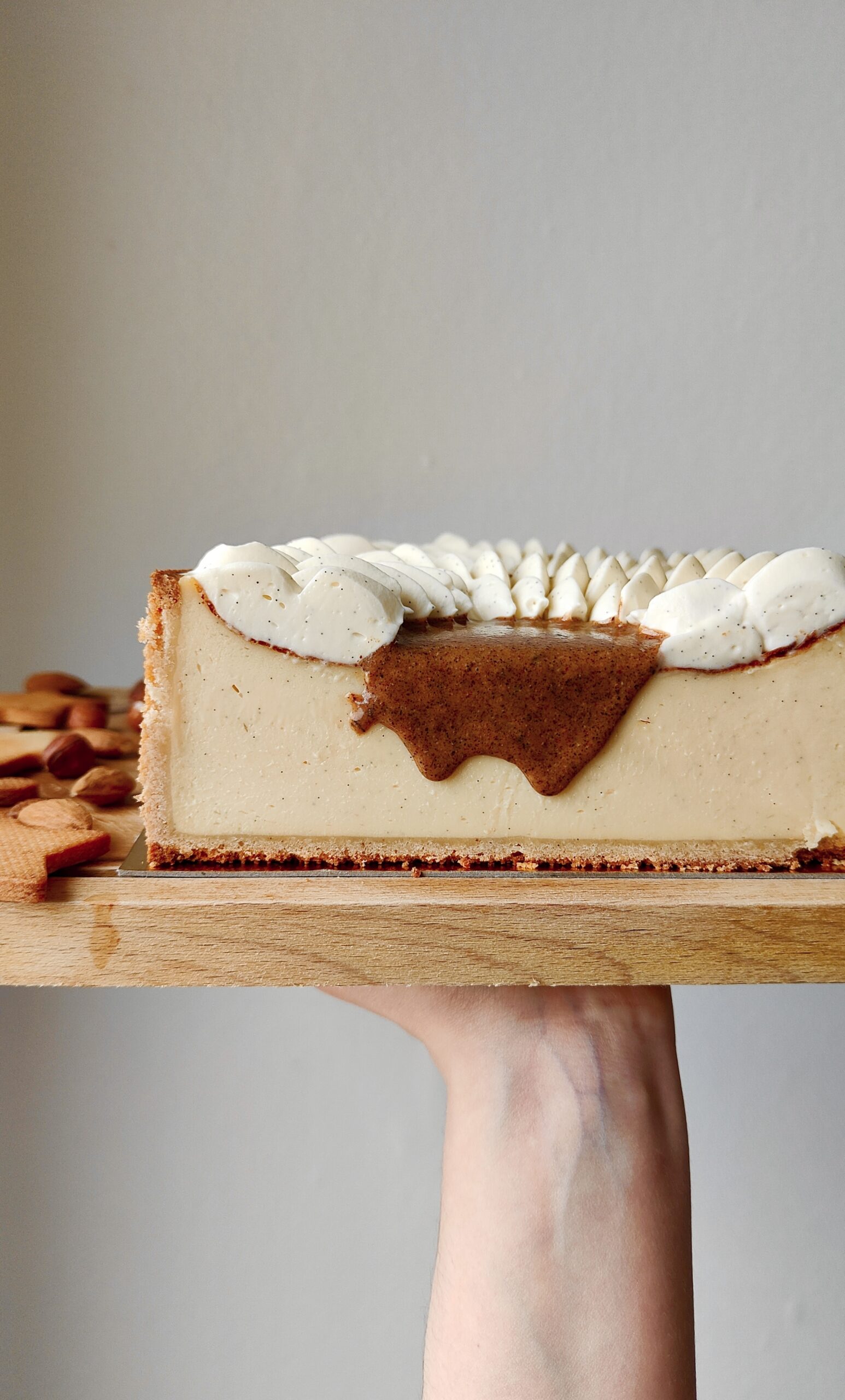 - Faites des larmes de ganache montée sur le pourtour du flan, puis versez un peu de praliné vanille au centre.