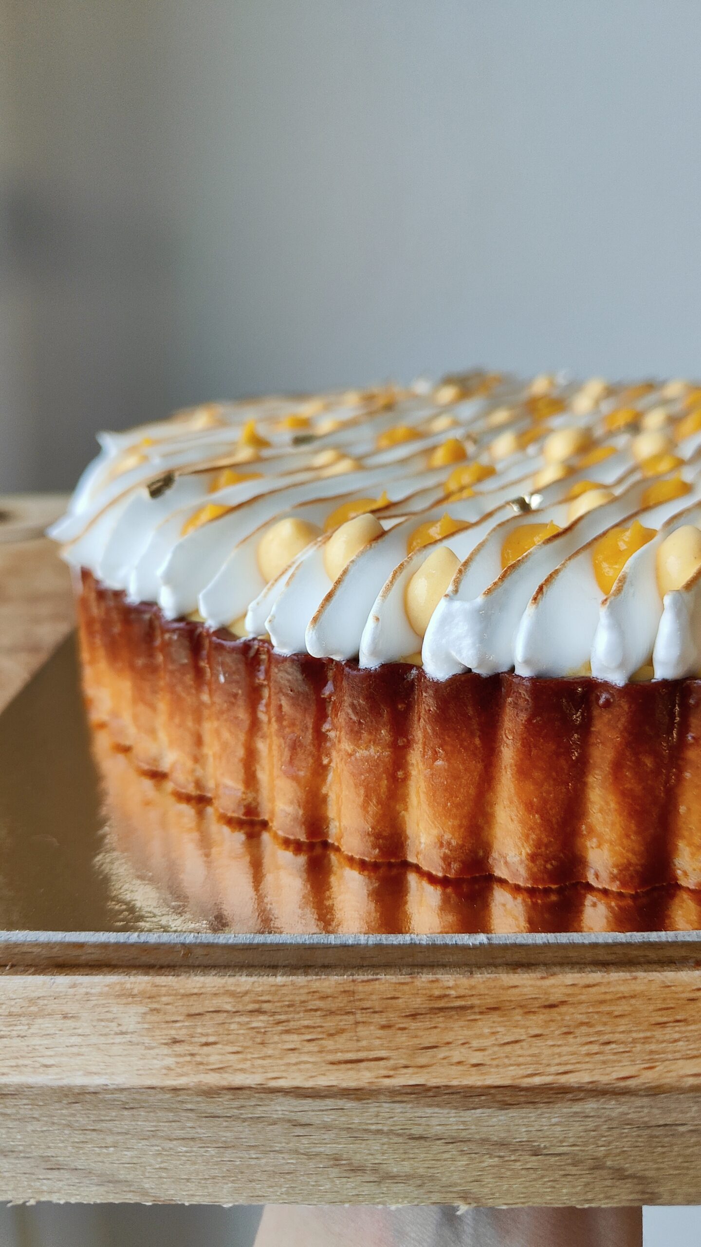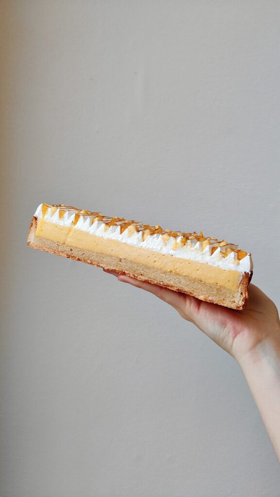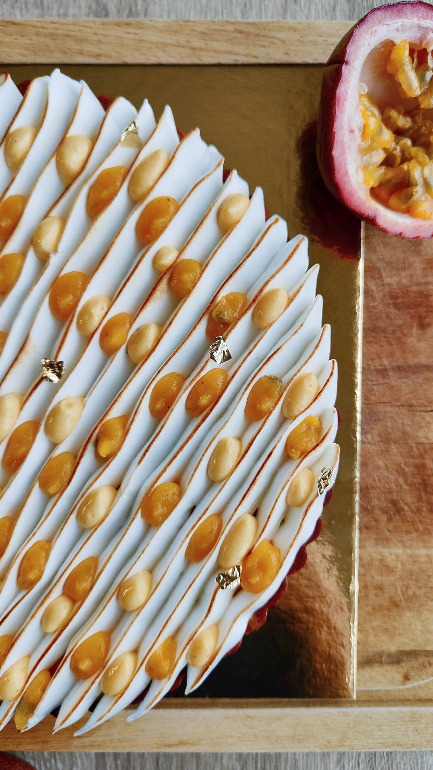 Une pâte sucrée amande bien dorée, une crème d'amande fondante, un crémeux passion intense et onctueux, quelques pointes de gel passion pour le côté acidulé et une meringue italienne lisse et soyeuse.