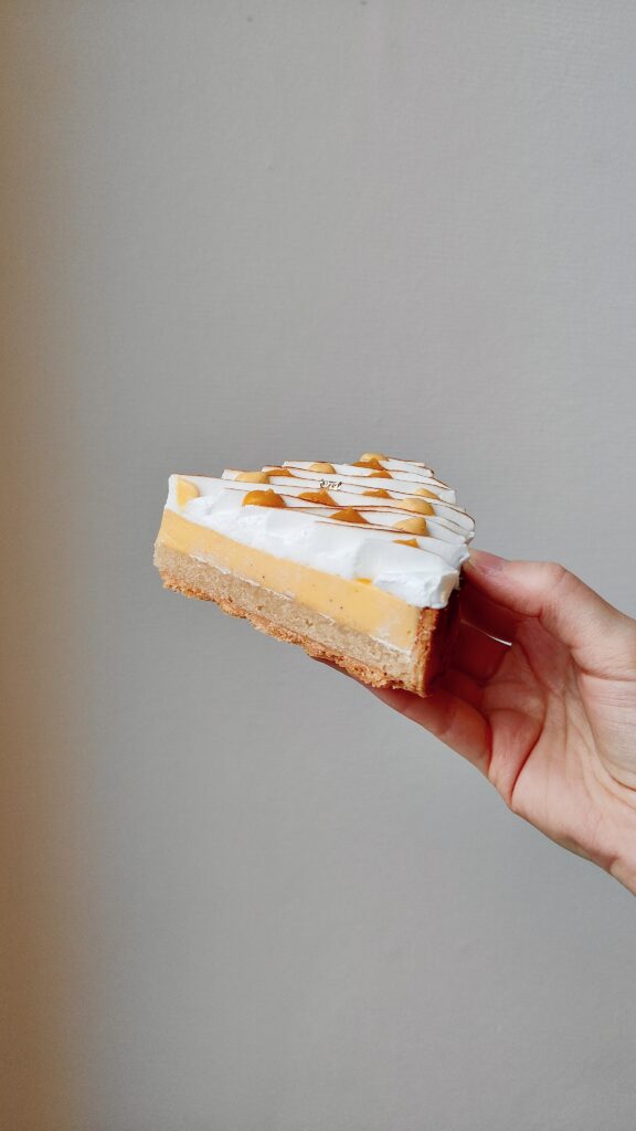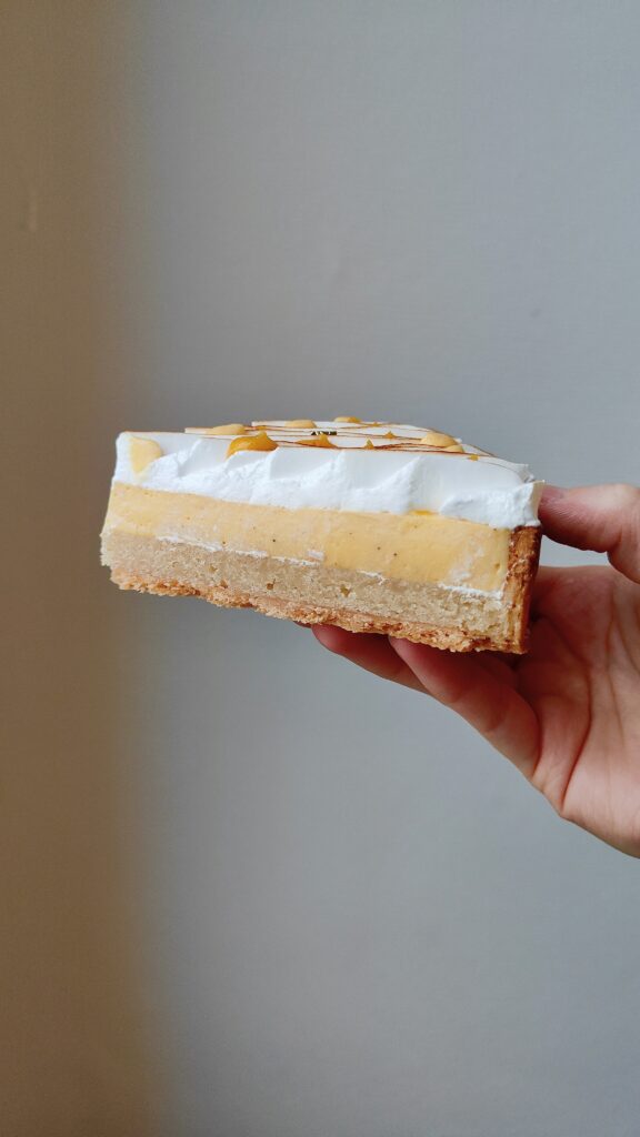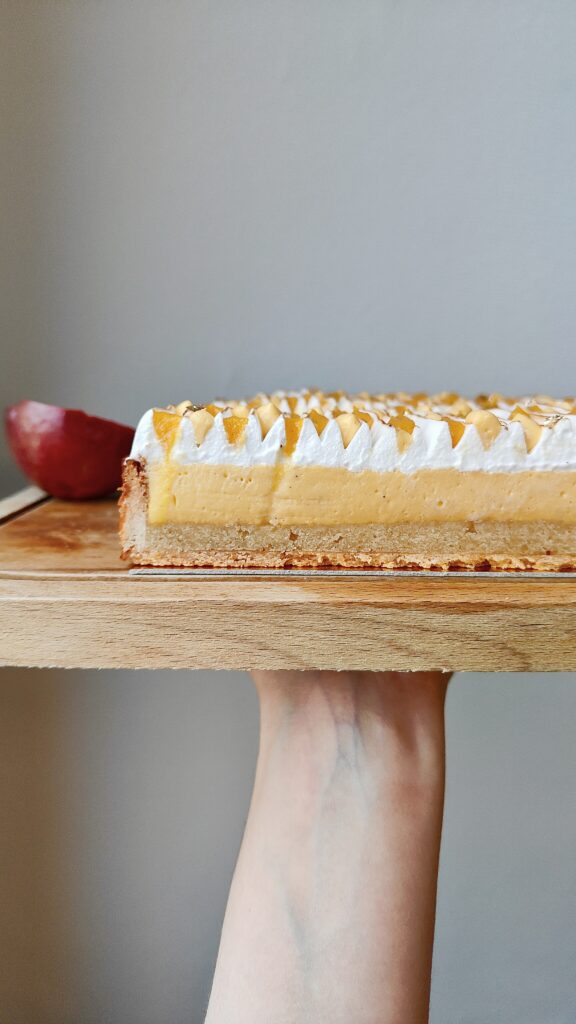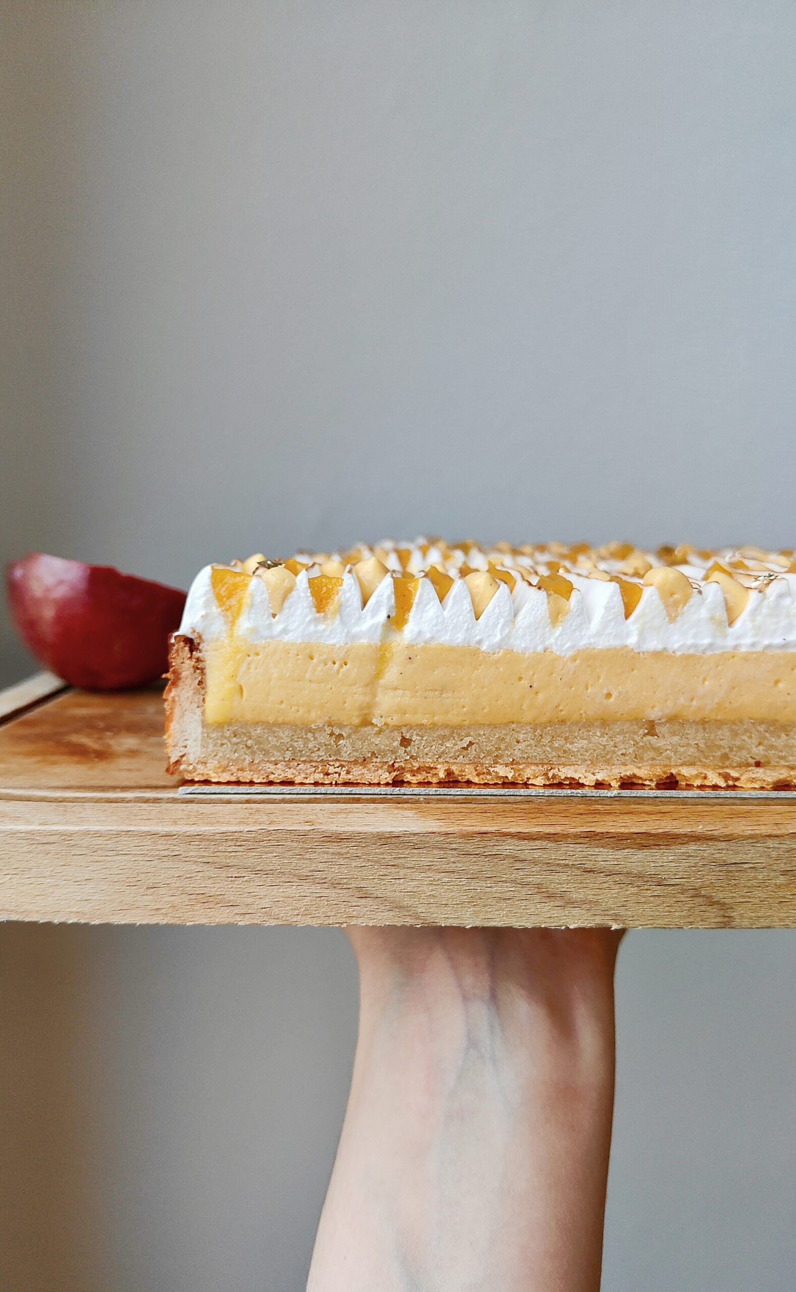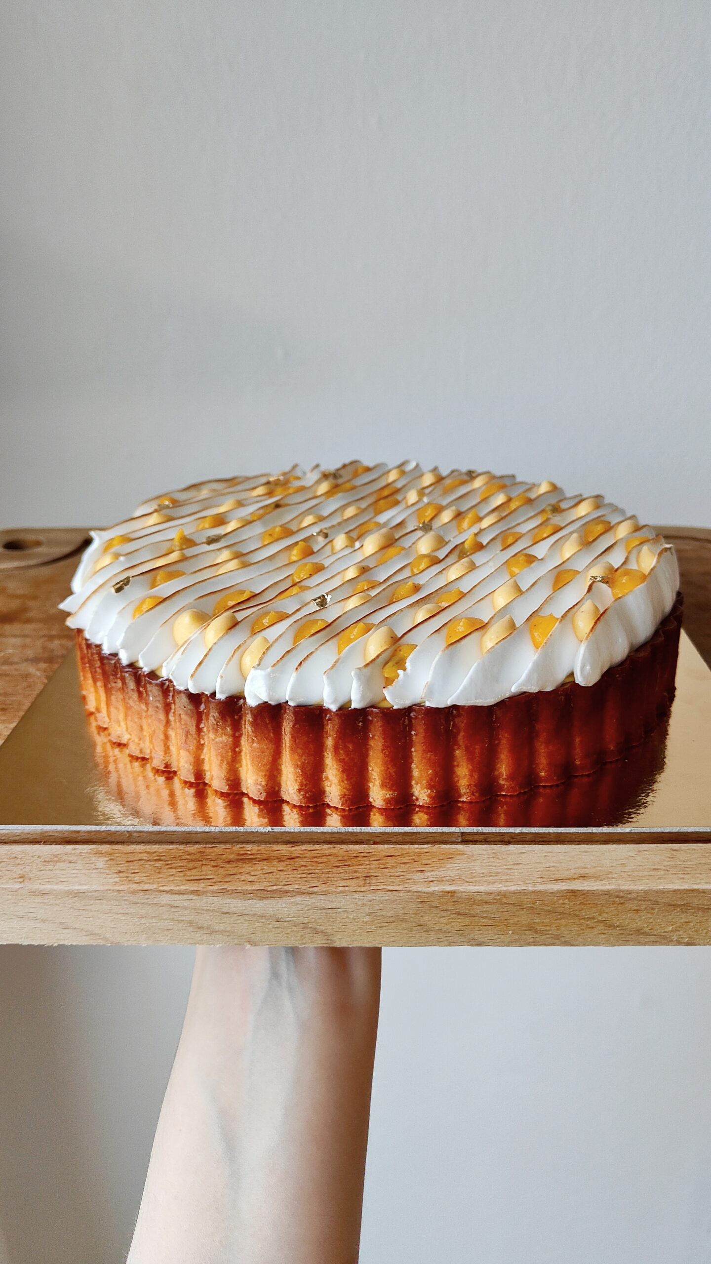 Une pâte sucrée amande bien dorée, une crème d'amande fondante, un crémeux passion intense et onctueux, quelques pointes de gel passion pour le côté acidulé et une meringue italienne lisse et soyeuse.