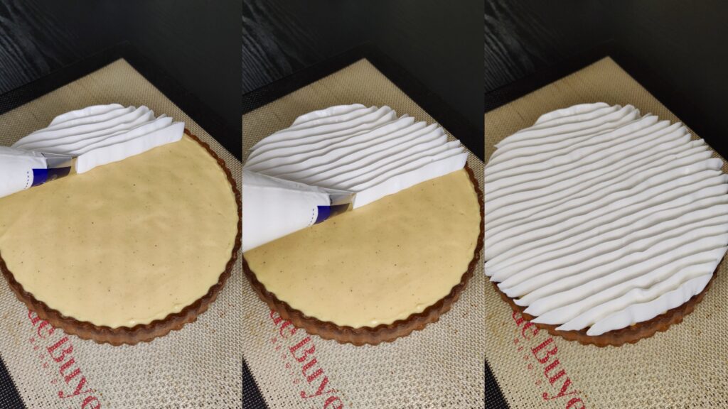 • Pochez des bandes de meringue parallèlement sur le crémeux passion.