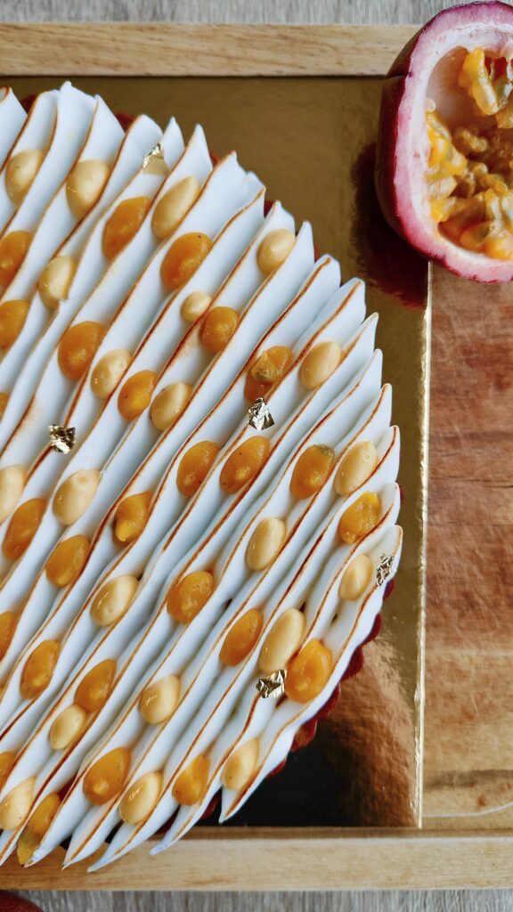 Mot-clé: Crème d’amande, Crémeux passion, Fruit de la passion, Gel passion, Maracuja, Meringue italienne, Pâte sucrée amande, Tarte, Tarte aux fruits de la passion meringuée