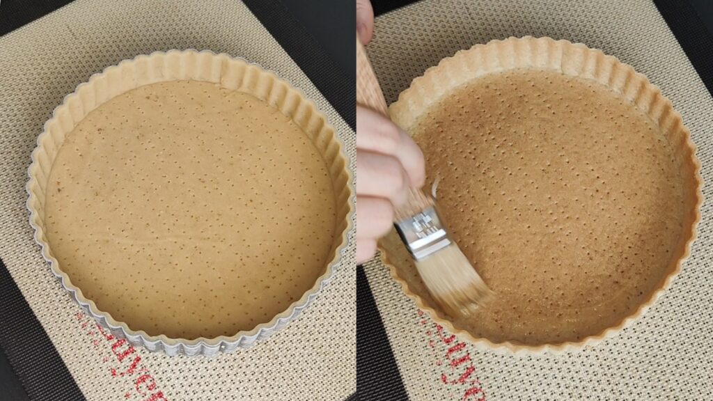 - Mélangez le jaune d’oeuf avec la crème liquide. À l’aide d’un pinceau, appliquez votre dorure sur le fond de tarte refroidi ainsi que les bords.
