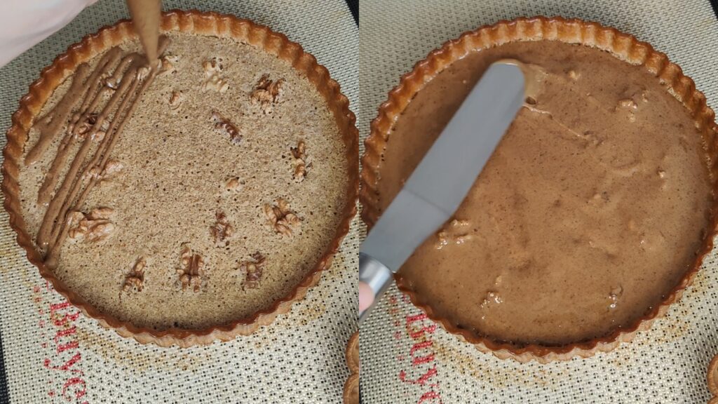 - Etalez la crème de noix dans le fond de votre tarte refroidi jusqu'à mi-hauteur.Placez-y quelques noix et enfournez pendant 15-20min, toujours à 160°C chaleur tournante.La crème de noix est cuite quand elle est légèrement dorée sur le dessus.