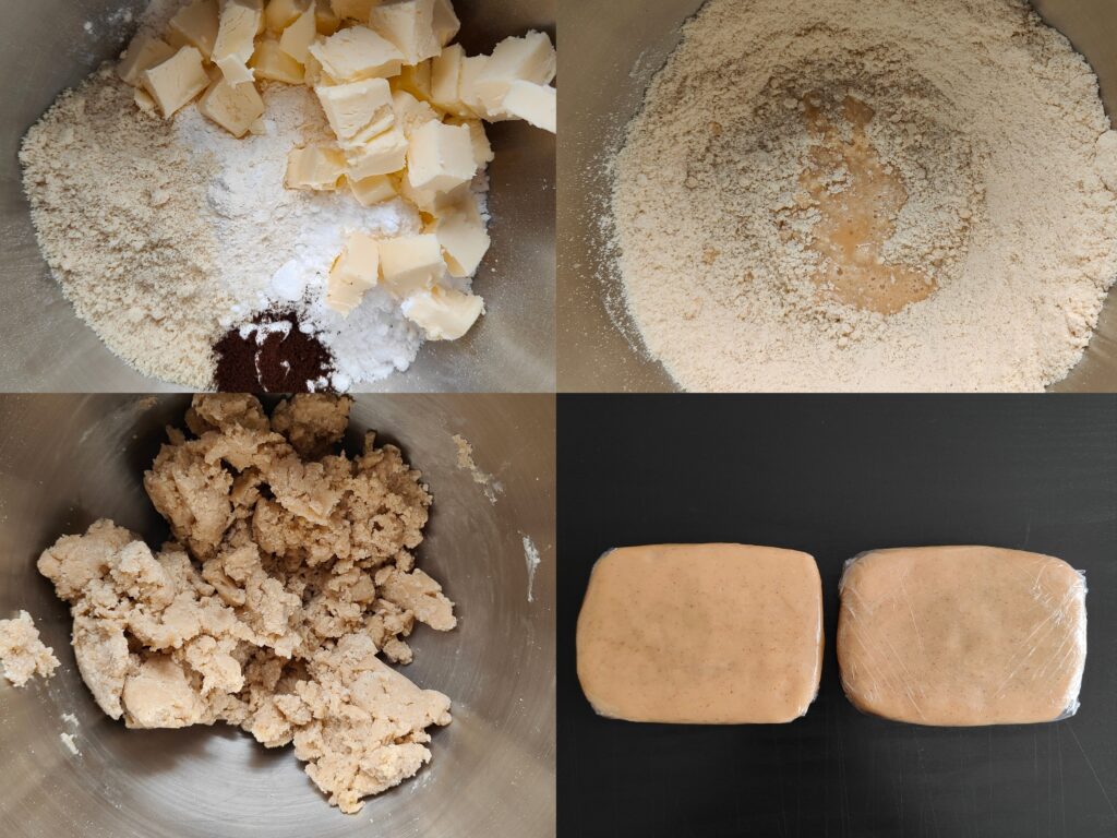 - Dans la cuve d'un batteur muni d'une feuille (ou dans un cul-de-poule, à l'aide d'une spatule et de vos mains), mélangez tous les ingrédients ensemble sauf l'oeuf. Sablez le tout à vitesse faible/moyenne.