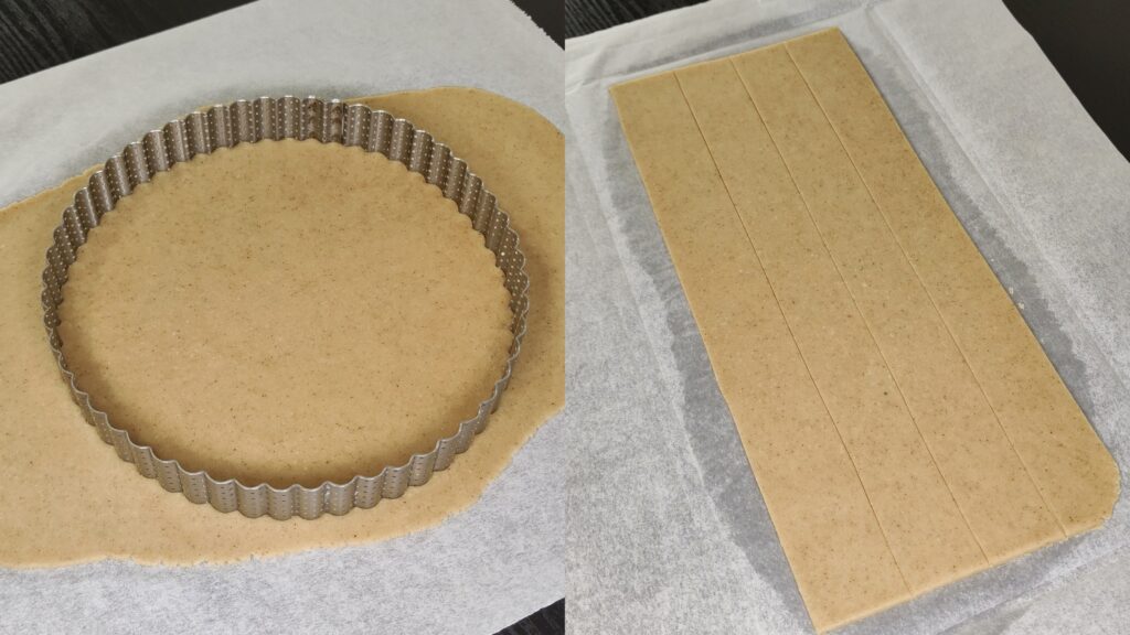 - Le lendemain, abaissez votre pâte à 3mm d'épaisseur entre deux feuilles de papier sulfurisé ou des feuilles de papier guitare.(N'hésitez pas à la remettre au frais/congélateur pendant quelques minutes avant de foncer votre cercle. La pâte sucrée n'aime pas la chaleur et devient impossible à manipuler.)