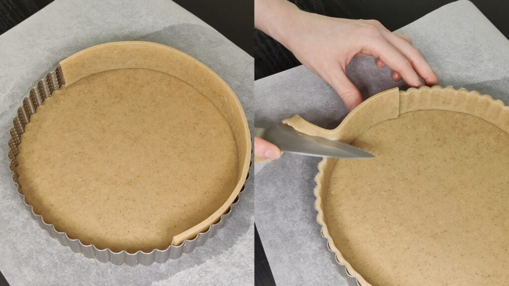 - Placez à l'intérieur le disque de pâte, puis les deux bandes de pâte en les soudant bien entre elles, et arasez l'excédent de pâte avec un couteau bien aiguisé.