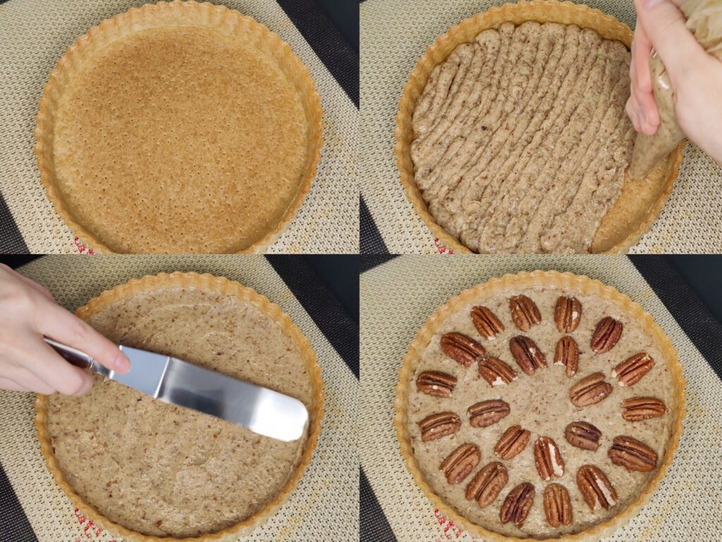 - Etalez la crème dans le fond de votre tarte refroidi jusqu'à mi-hauteur.Placez-y quelques noix de pécan entières et enfournez pendant 15-20min, toujours à 160°C chaleur tournante.La crème de noix de pécan est cuite quand elle est légèrement dorée sur le dessus.