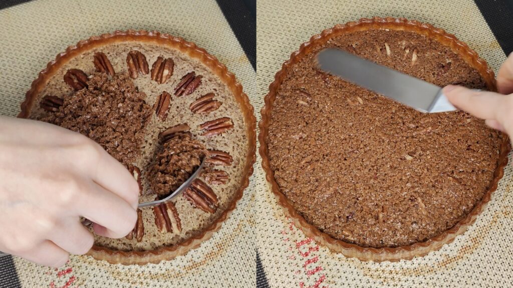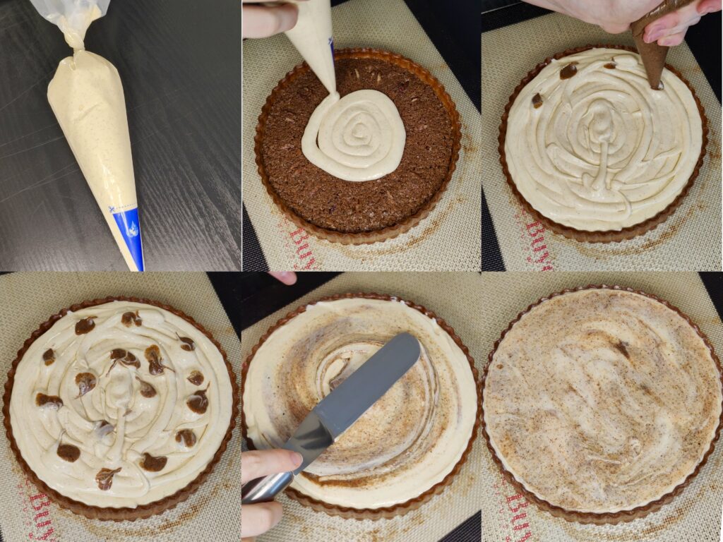 - À l'aide d'une spatule (ou le dos d'une cuillère), appliquez une fine couche de croustillant praliné sur la crème de noix de pécan cuite.Réservez au frais 10-15min avant de passer au montage.