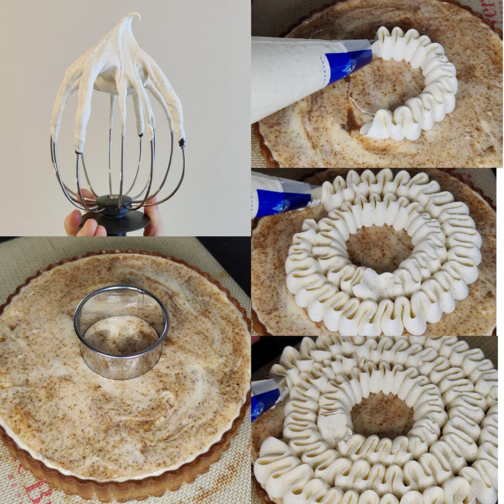 - Réalisez le pochage "zigouigoui" en partant du centre jusqu'à l'extérieur de la tarte.Aidez-vous en faisant une marque à l'aide d'un emporte-pièce pour faire une marque au centre de la tarte pour un rendu régulier.