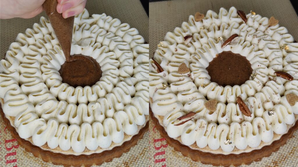 - Appliquez du praliné pécan au centre.Remettez votre tarte au frais quelques minutes (au moins 15-20min) le temps que la ganache montée fige un peu, puis dégustez !