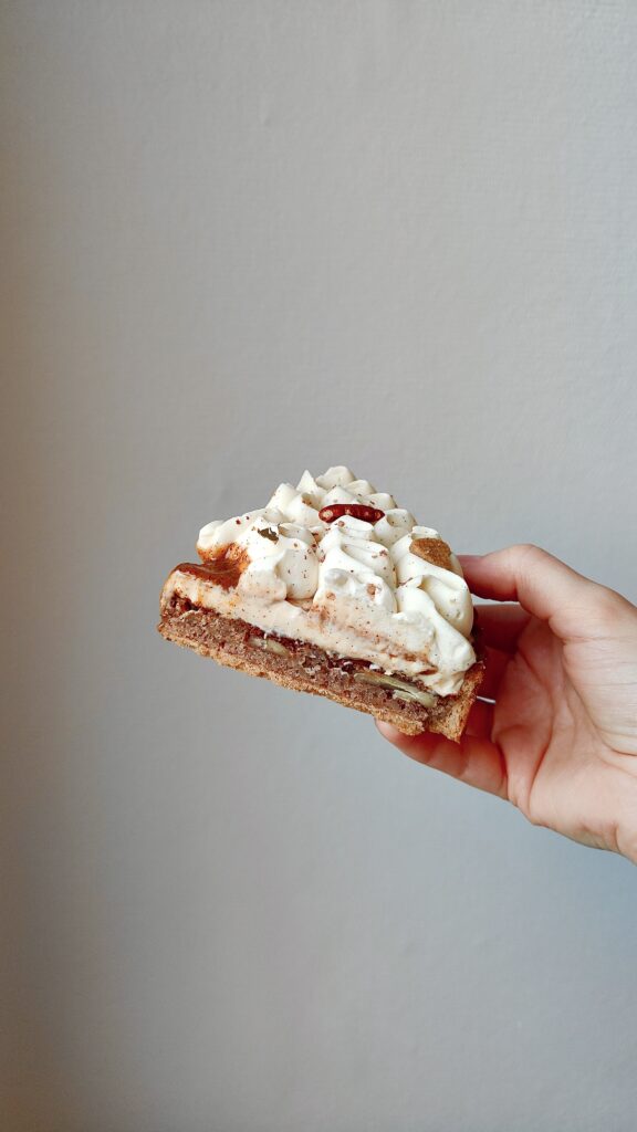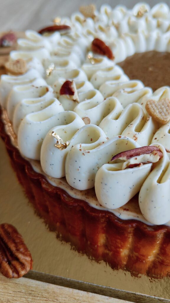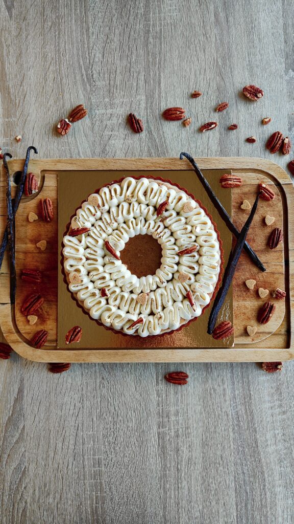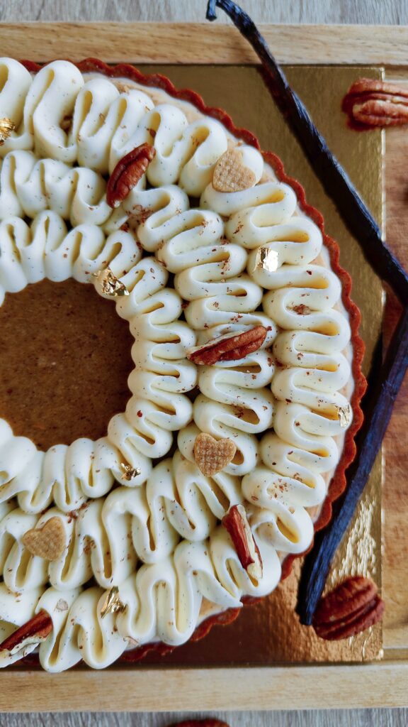 Une tarte vanille-pécan à la fois fondante, onctueuse, croquante, croustillante et pleine de douceur !Sous cette légère ganache montée à la vanille se cachent un crémeux vanille, un croustillant praliné pécan et une crème de noix de pécan, le tout dans une pâte sucrée vanille bien dorée. Sans oublier ce coeur coulant praliné pécan… 🤎