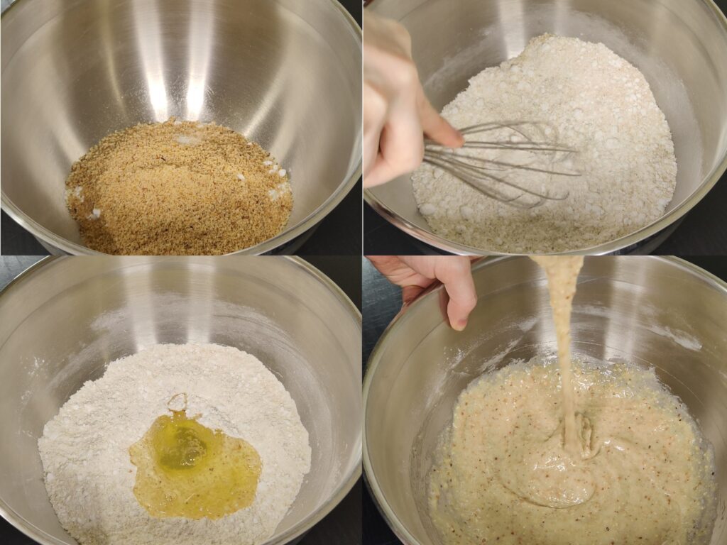 - Dans le grand cul-de-poule, ajoutez la farine, la poudre de noisettes, le sucre glace et la pincée de sel et mélangez un peu avec votre fouet. Versez les blancs d'oeufs et mélangez jusqu'à obtenir une texture lisse et homogène.