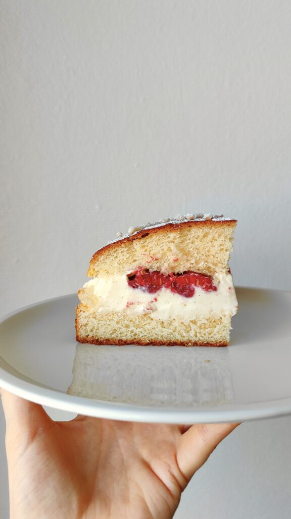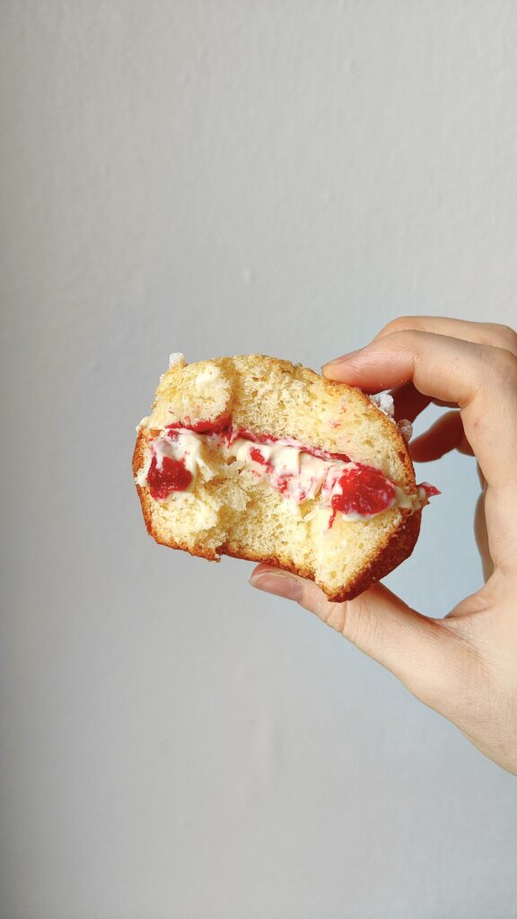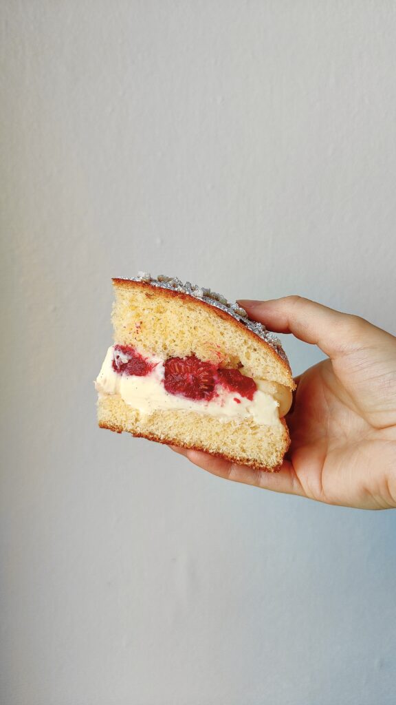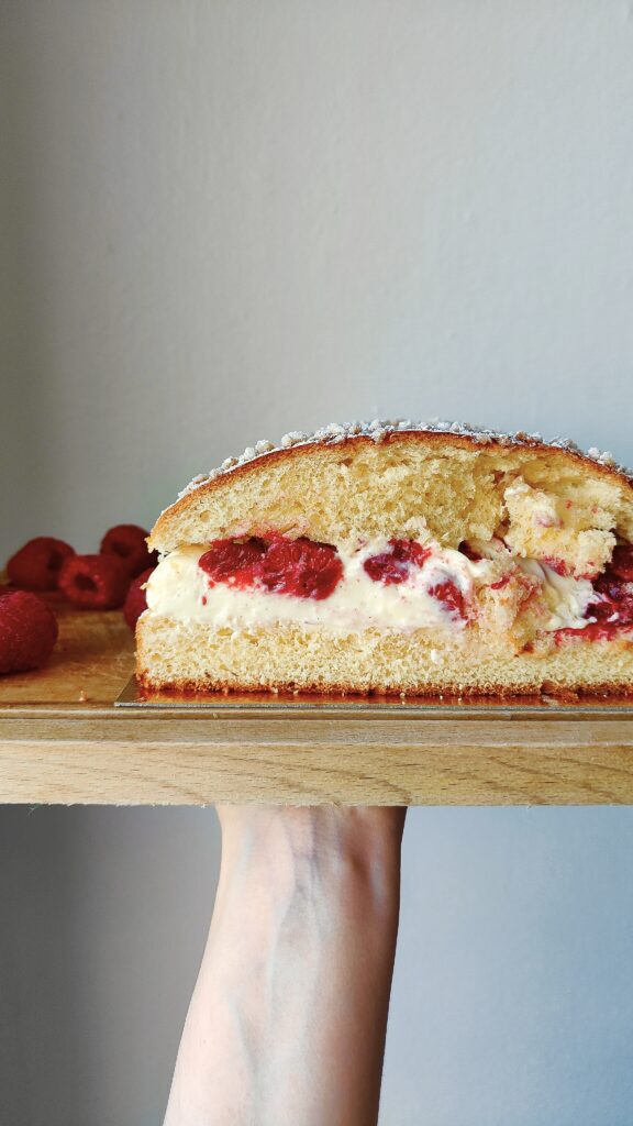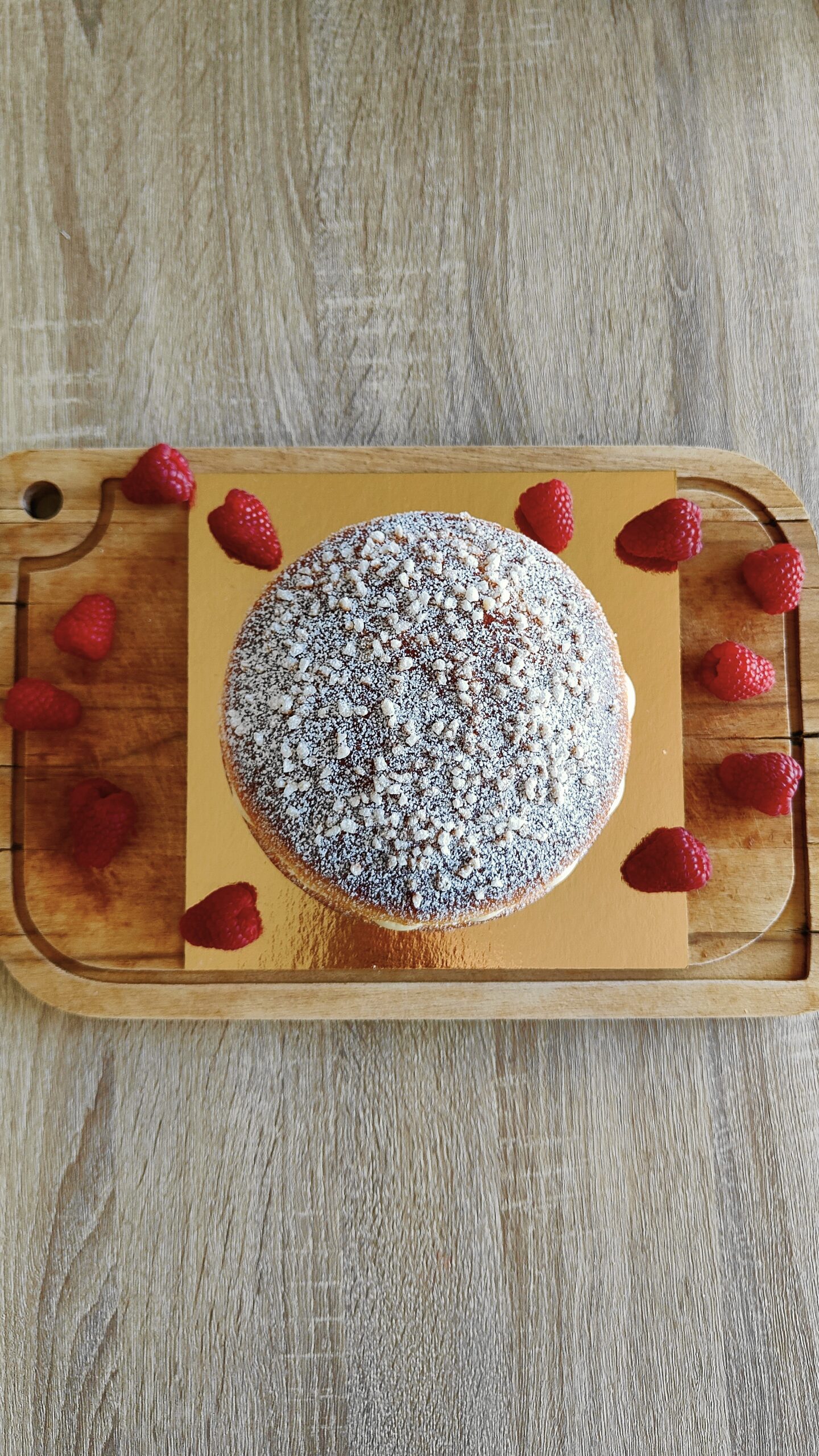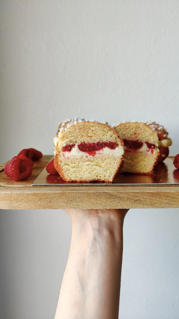 Rien de tel qu'une belle tropézienne vanille framboise pour se faire plaisir ! Une brioche bien moelleuse et légère, délicatement parfumée à la fleur d’oranger, accompagnée d'une crème diplomate douce et onctueuse à la vanille et d'une compotée de framboises pour la touche de fraîcheur et acidulée.