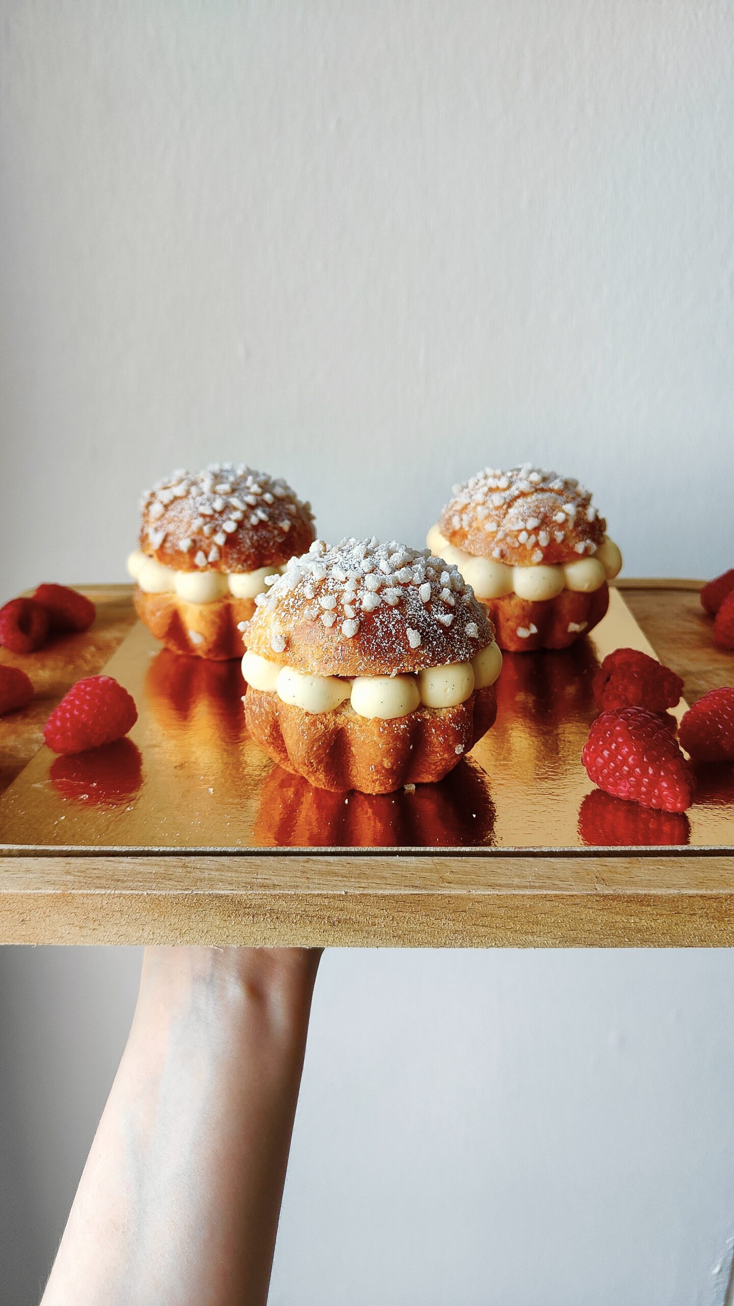 - Pour les minis tropéziennes : Badigeonnez-les également de dorure et parsemez-les de sucre en grains. Enfournez-les pendant 20min à 160°C, chaleur tournante. Retirez-les rapidement des moules pour éviter la condensation.
