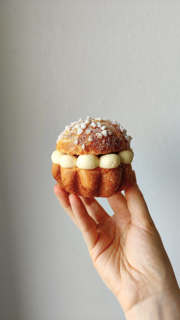 - Pochez des boules de crème diplomate sur le pourtour de la brioche et tracez un tourbillon de crème au milieu.