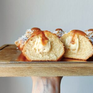 Voici ces petites brioches fourrées toutes moelleuses, inspirées de la recette du chef Yann Couvreur, extraite de son livre "12 Saisons". Elles sont garnies généreusement d'une crème à flan onctueuse, d'un caramel à la vanille, et parsemées d'un streusel ainsi que de sucre en grains pour le côté croquant. Le tout est relevé d'un léger arôme d'eau de fleur d'oranger. De vraies petites douceurs !